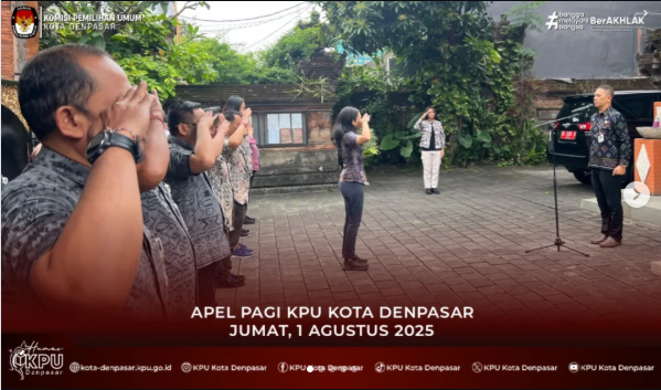 #temanpemilih & #wargakotadenpasar Komisi Pemilihan Umum (KPU) Kota Denpasar melaksanakan Apel Pagi di halaman Kantor KPU Kota Denpasar. Jumat (1/8/2025). Bertindak sebagai pembina apel pagi adalah Sekretaris KPU Kota Denpasar, I Made Wirawan. Apel pagi diikuti oleh Ketua KPU Kota Denpasar dan seluruh Jajaran Sekretariat KPU Kota Denpasar, serta Mahasiswa yang melaksanakan Praktek Kerja Lapangan (PKL) di KPU Kota Denpasar. Sebagai pembina apel, Made Wirawan memberikan arahan, terkait kegiatan KPU RI yang dilaksanakan di Bali, bagi yang mengikuti kegiatan tersebut agar dilaksanakan dengan baik. Wirawan menginstruksikan agar menjaga kebersihan dan kenyamanan kantor. Tidak bosan Made Wirawan mengingatkan jajaran sekretariat agar selalu menerapkan 3S, yaitu Sapa, Salam dan Senyum dalam menjalankan tugas di KPU Kota Denpasar. "Jaga disiplin, loyalitas dan soliditas", imbuh Wirawan. Sebelum apel pagi dibubarkan, seluruh jajaran KPU Kota Denpasar yang mengikuti apel pagi melaksanakan doa bersama. Tujuannya agar segala aktivitas/pekerjaan yang dilakukan oleh sekretariat KPU Kota Denpasar berjalan lancar. Pelaksanaan apel pagi bertujuan untuk mendengar arahan pimpinan, meningkatkan disiplin dan tanggung jawab kerja, memupuk rasa kebersamaan dan kekeluargaan di lingkungan kerja KPU Kota Denpasar, membantu kelancaran pelaksanaan tugas dan fungsi, memberikan pembinaan dan pengawasan, menyampaikan informasi pelaksanaan program dan kegiatan yang akan dilaksanakan. (SM/Humas/KPU-DPS). "Ngulati Denpasar Shanti"