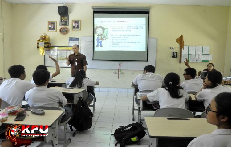 Denpasar, kpu-denpasarkota.go.id-Komisi Pemilihan Umum (KPU) Kota Denpasar menggelar sosialisasi bagi pemilih pemula di SMAN 5 Denpasar. Kamis (7/9/17). Sosialisasi berupa kelas pemilu diikuti oleh 34 siswa kelas XI MIPA I bertempat di ruang kelas XI MIPA I SMAN 5 Denpasar.