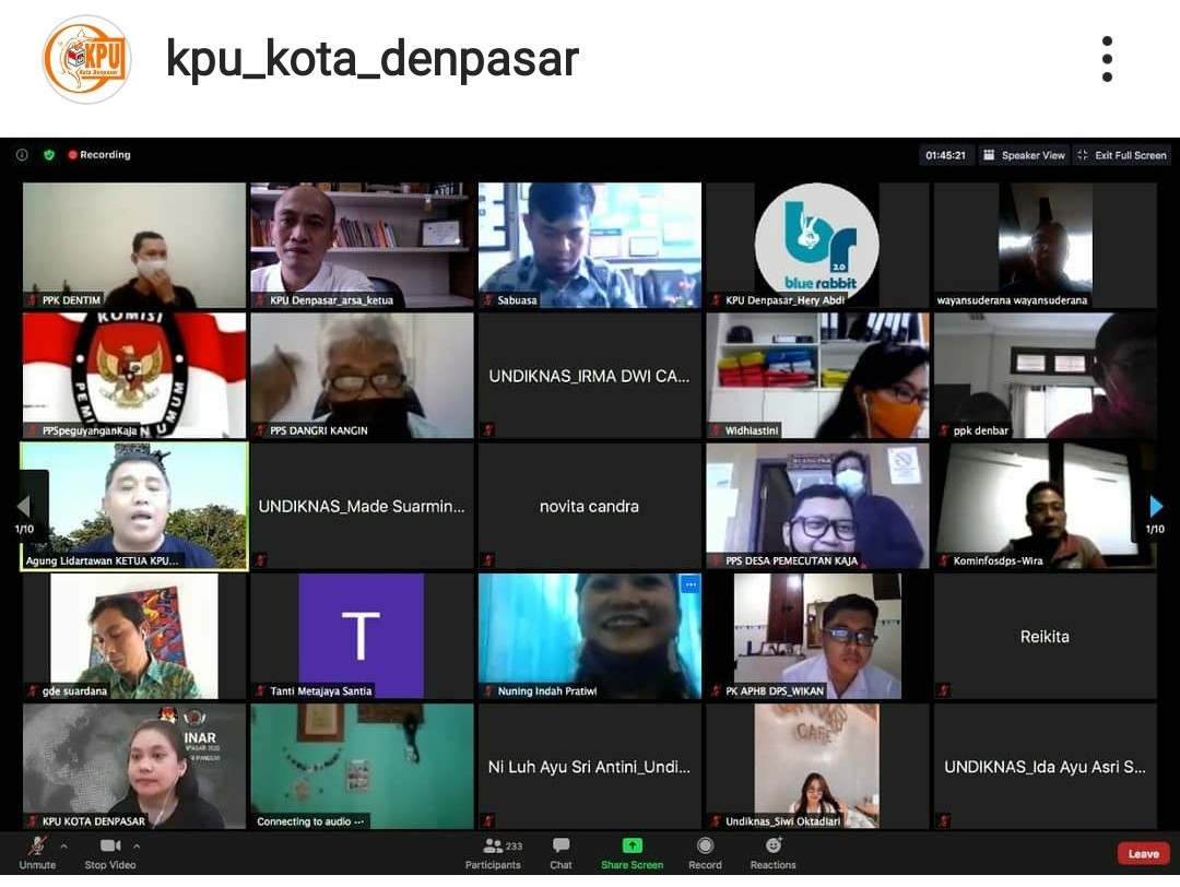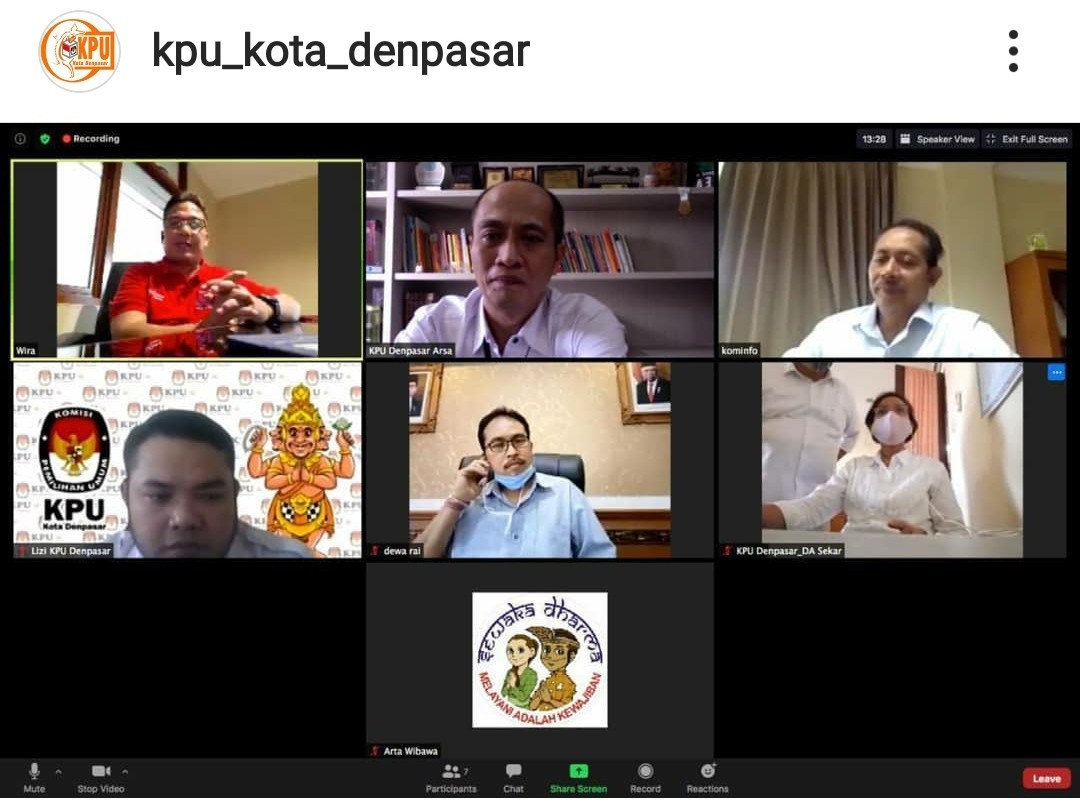 Pemilih Denpasar, Jumat (10/07/20) pukul 10.00-12.00 Wita, KPU Kota Denpasar bekerjasama dengan Universitas Pendidikan Nasional (Undiknas) menyelenggarakan Webinar Pemilihan Walikota Dan Wakil Walikota Denpasar Tahun 2020 Dalam Situasi Pandemi. I Dewa Agung Gede Lidartawan (Ketua KPU Propinsi Bali) dan Gede Suardana (Ketua Komite Demokrasi Bali) menjadi narasumber dalam webinar ini. Webinar ini diikuti oleh Mahasiswa Undiknas, Media Electronic, Media Cetak Dan Media Online serta PPK dan PPS se-Kota Denpasar. Melalui Webinar ini harapannya pemilih terutama pemilih pemula dan pemilih muda mengetahui informasi tentang Pilwali Denpasar 2020, dan tidak was-was dalam menggunakan hak pilihnya 9 Desember 2020 mendatang.