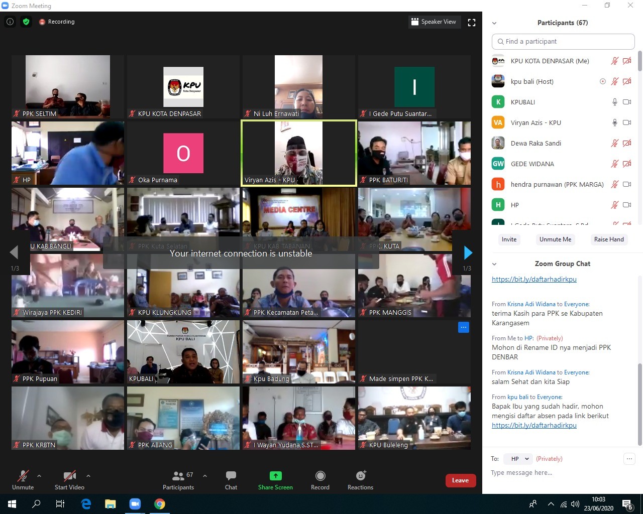Ni Ketut Dharmayanti Laksmi (Penanggungjawab Pokja) menambahkan rapid test bagi penyelenggara adhoc belum dapat dilakukan sampai saat ini, karena Dinas Kesehatan masih sibuk menangani penyebaran Covid-19 di masyarakat. Selain melakukan rapid test, KPU Kota Denpasar juga selalu menerapkan protokol kesehatan pencegahan Covid-19 dalam bertugas. Novi Febriani (Anggota Pokja dari AJI) mengingatkan KPU Denpasar agar lebih intens dan kreatif dalam penyebarluasan informasi sehingga target partisipasi massyarakat dalam Pilwali 2020 ini bisa tercapai. Menanggapi hal tersebut, Sibro dan Laksmi meminta bantuan AJI dan teman-teman media membantu untuk menyebarluaskan informasi terkait pelaksanaan Pilwali, 9 Desember 2020 serta mengedukasi masyarakat tentang protokol kesehatan yang akan selalu diterapkan oleh KPU Kota Denpasar dalam pelaksanaan tugasnya sampai di tingkatan TPS. Dengan demikian penyelenggara, peserta, dan pemilih dapat bersama-sama berperan dalam menyukseskan Pilwali 2020 tanpa terpapar Covid-19 (DMN/Hupmas/KPU-DPS)