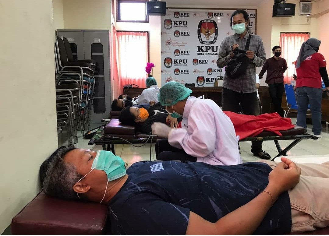 Denpasar, kpu-denpasarkota.go.id- Bertempat di KPU Kota Denpasar JL. Raya Puputan Renon, KPU Provinsi Bali melaksanakan kegiatan donor darah. (13/4/2020). Peserta yang mengikuti donor darah adalah ketua KPU Provinsi Bali, Ketua dan Anggota, Sekretaris dan staf KPU Kabupaten/Kota se-Bali, serta PPK se-Kota Denpasar dan jurnalis. Menurut Ketua KPU Provinsi Bali I Dewa Agung Gede Lidartawan, tujuan kegiatan ini adalah upaya KPU untuk turut berkontribusi menjawab panggilan kemanusiaan dalam rangka memastikan ketersediaan darah ditengah pandemi COVID-19. "Hari ini kami dapat mengumpulkan 35 kantong darah yang di fasilitasi oleh PMI Bali" Imbuh Lidartawan seusai beliau mendonorkan darahnya. Dalam kegiatan donor darah tersebut, KPU Kota Denpasar sangat memperhatikan protokol kesehatan dalam upaya pencegahan dan memutus penyebaran pandemi COVID-19. Peserta datang secara bergiliran untuk menghindari kerumunan banyak orang, KPU Kota Denpasar juga menyemprotkan disinfektan secara rutin pagi dan sore secara swadaya, menyediakan hand sanitizer dan tempat cuci tangan portable serta mewajibkan seluruh peserta menggunakan masker. (SM/Hupmas/KPU-DPS).