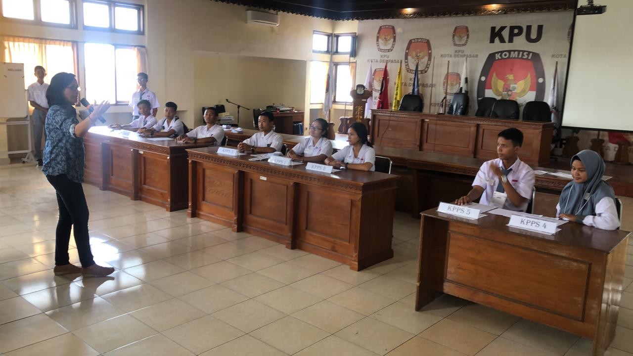 Ni Ketut Dharmayanti Laksmi (Anggota KPU Kota Denpasar Divisi Sosialisasi, Pendidikan Pemilih, Partisipasi Masyarakat dan Pengembangan SDM) memberikan gambaran umum tentang pemilu kepada para siswa, lalu mengajak mereka melihat proses pemungutan suara yang tersaji dalam maket. Laksmi juga mengajak para siswa bermain peran dalam simulasi pemungutan suara. Ada siswa yang menjadi KPPS, Pengawas TPS, Saksi, Petugas Keamanan maupun pemilih. Simulasi ini bertujuan untuk memberikan gambaran jelas serta pemahaman kepada para siswa tentang pelaksanaan pemungutan suara di TPS. Dengan melakukan simulasi ini, harapannya para siswa yang merupakan pemilih pemula tahu apa saja yang dilakukan saat pemungutan suara. Usai melakukan simulasi, Laksmi mengajak para siswa melihat beberapa video terkait pemilu di ruang audio visual. Selain menyaksikan video, para siswa juga mengisi TTS Digital. “Dengan mengisi TTS Digital ini, kita bisa tahu sejauh mana mereka paham dengan penjelasan yang disampaikan sebelumnya, ya semacam evaluasi gitu”ungkap Laksmi. Permainan Peran dan TTS Digital harapannya dapat memudahkan para siswa memahami tentang pemilu. (DMN/Hupmas/KPU-DPS)