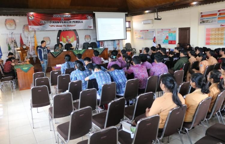 Denpasar, kpu-denpasarkota.go.id- Jumat (26/10/18), KPU Kota Denpasar mengundang siswa dan siswi dari 13 SMA/SMK Negeri se-Kota Denpasar untuk mengikuti Sosialisasi serta Pendidikan Pemilih Pemula “ KPU Goes To School”. Namun dari 13 SMA/SMK yang diundang hanya 9 SMA/SMK yang hadir dengan total 66 siswa. Sosialisasi dan Pendidikan Pemilih Pemula tersebut berlangsung pukul 10.00 wita di Aula Kantor KPU Kota Denpasar. Ketua KPU Kota Denpasar, I Wayan Arsa Jaya membuka acara dan menyampaikan apresiasinya terhadap para siswa yang bersedia mengikuti kegiatan ini. Arsa juga menjelaskan tujuan dari sosialisasi dan pendidikan pemilih pemula ini memberikan informasi dan pemahaman tentang Pemilu serta menggugah kesadaran kaum muda untuk menggunakan hak pilihnya dengan benar sehingga partisipasi masyarakat dalam Pemilu meningkat. Partisipasi masyarakat yang tinggi dalam Pemilu akan mendorong kehidupan berdemokrasi yang sehat. Pemimpin yang terpilih nantinya benar-benar didukung oleh masyarakat. Sosialisasi dan pendidikan pemilih disampaikan oleh I Gede John Darmawan (Divisi SDM dan Parmas KPU Propinsi Bali) selaku narasumber dipandu oleh Ni Ketut Dharmayanti Laksmi (Divisi SDM dan Parmas KPU Kota Denpasar). John Darmawan menjelaskan tentang demokrasi, Pemilu di Indonesia, tata cara menggunakan hak pilih, dan pentingnya menggunakan hak pilih. John berharap para siswa yang merupakan pemilih pemula dapat menggunakan hak pilihnya. “17 April 2019 nanti gunakanlah hak pilih kalian, datang ke TPS ajak teman dan keluarga, mari kita pilih wakil rakyat dan presiden yang tepat untuk masa depan negara yg lebih baik, “ajak John. Selanjutnya John mengajak para siswa untuk mendownload aplikasi KPU RI Pemilu 2019, untuk memperoleh informasi tentang pemilu dan mengecek apakah mereka sudah terdaftar sebagai pemilih atau belum. John menghimbau para siswa agar memanfaatkan aplikasi tersebut untuk mengecek data pemilih teman, guru, maupun keluarga mereka. Selain KPU Kota Denpasar, I Wayan Sudarsana (Anggota Bawaslu Kota Denpasar) yang hadir dalam sosialisasi ini juga memotivasi pemilih pemula agar peka terhadap pelanggaran Pemilu. “ayo sahabat, bersama bawaslu awasi pelanggaran dalam pemilu,”ujar Sudarsana. Usai mensosialisasikan pemilu, KPU Kota Denpasar membuka ruang diskusi. Para siswa mengajukan beberapa pertanyaan seperti suara sah/tidak sah, alasan digunakannya tinta sebagai penanda telah memilih, sanksi bila tidak gunakan hak pilih, motivasi KPU kepada masyarakat untuk gunakan hak pilih, ingin memilih tapi tak memiliki e-KTP, serta cara menanggulangi money politic. John Darmawan dan Wayan Sudarsana pun memberikan tanggapan terhadap pertanyaan-pertanyaan tersebut. Para siswa juga melakukan simulasi pemungutan suara. Di akhir acara, KPU Kota Denpasar memberikan souvenir bagi siswa dan siswi yang aktif dalam diskusi maupun simulasi pemungutan suara. dmn/smt