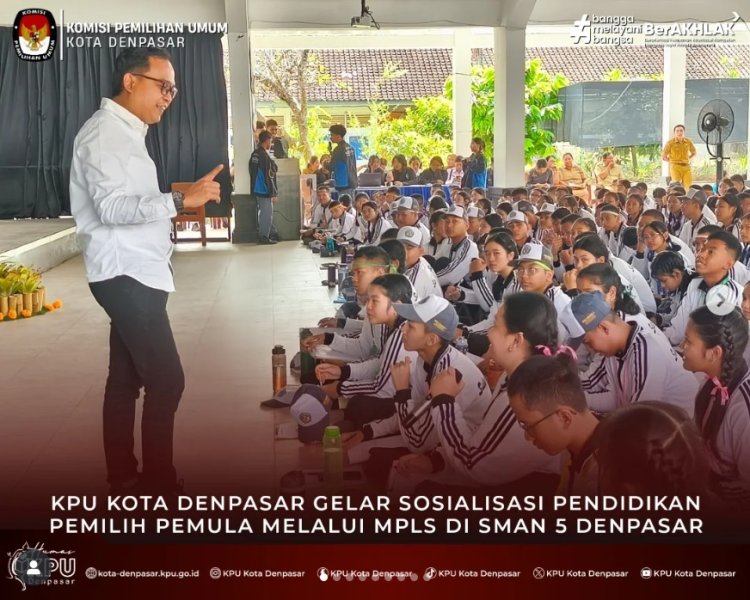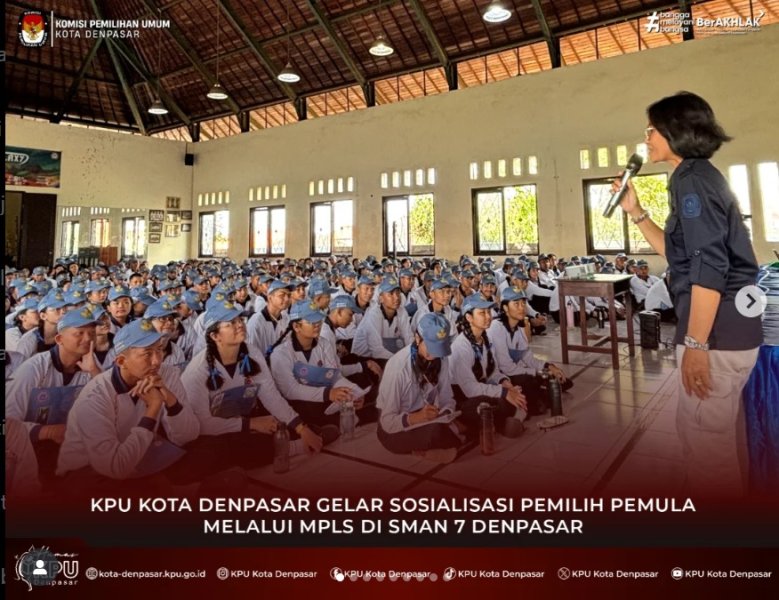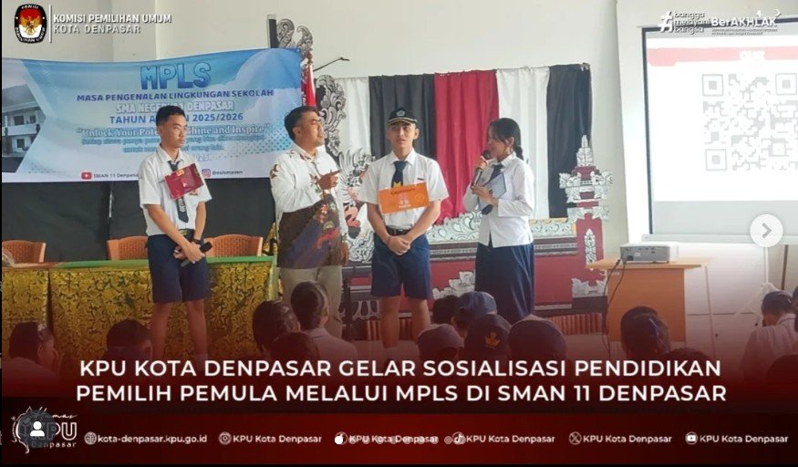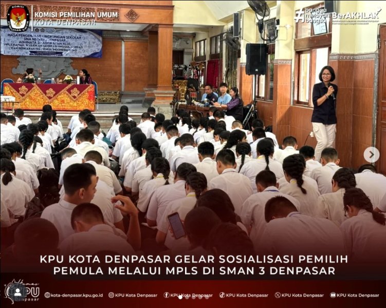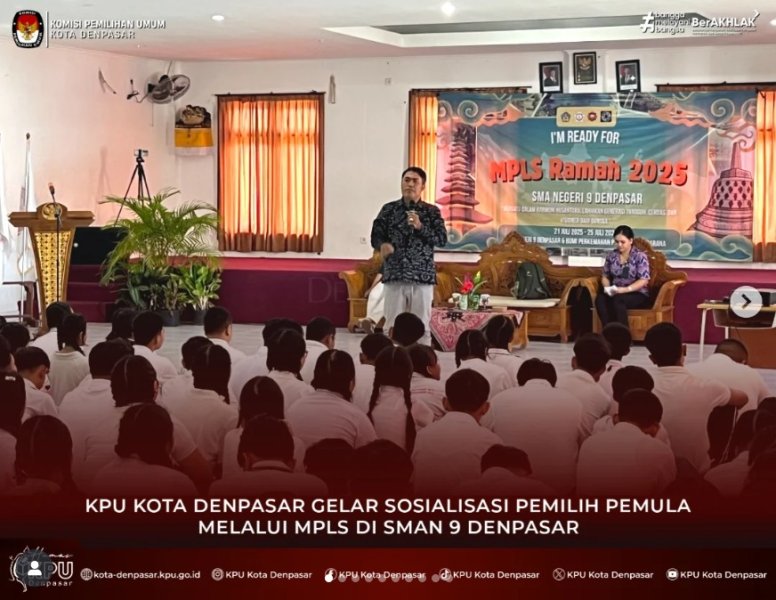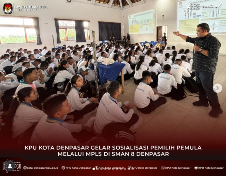 #temanpemilih & #wargakotadenpasar Komisi Pemilihan Umum (KPU) Kota Denpasar melaksanakan program KPU "Goes to School" di SMAN 8 Denpasar, Jl. Antasura Jl. Dam Peraupan No.25, Peguyangan Kaja, Kec. Denpasar Utara. Selasa (22/7/2025). Kegiatan KPU "Goes to School" tersebut dilaksanakan dalam rangka sosialisasi pendidikan pemilih pemula melalui MPLS di SMAN 8 Denpasar. Diikuti oleh 432 orang siswa baru SMAN 8 Denpasar yang mengikuti kegiatan MPLS. Bertindak sebagai narasumber dalam sosialisasi pendidikan pemilih pemula melalui MPLS tersebut adalah Ketua Divisi Perencanaan, Data dan Informasi KPU Kota Denpasar, Sibro Mulissyi Dalam sosialisasinya, Sibro Mulissyi menjelaskan demokrasi adalah suatu gagasan yang dikembangkan sebagai mekanisme untuk mewadahi beragam aspirasi dan kepentingan masyarakat dalam memecahkan persoalan bersama. Tujuan demokrasi memberikan rasa keamanan bersama dan kebebasan dalam berpendapat. Lembaga penyelenggara pemilu terdiri dari KPU, Bawaslu dan DKPP. Sejumlah siswa antusias memberikan pertanyaan dan mendapatkan hadiah yang sudah disiapkan oleh tim dari KPU Kota Denpasar. Adapun pertanyaan dari Ni Made Ayu Diah dari Kelompok 6 pertanyaannya jika sudah di usia pemilih namun belum terverifikasi apa yg bisa dilakukan? Dan pertanyaan kedua dari Putu Yogi Ananta Kelompok 9 bertanya berapa batas Presiden bisa memimpin suatu negara. KPU "Goes to School" bertujuan untuk menanamkan Demokrasi dari sejak dini kepada generasi muda atau generasi Alpha. (SM/Humas/KPU-DPS). "Ngulati Denpasar Shanti"