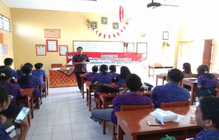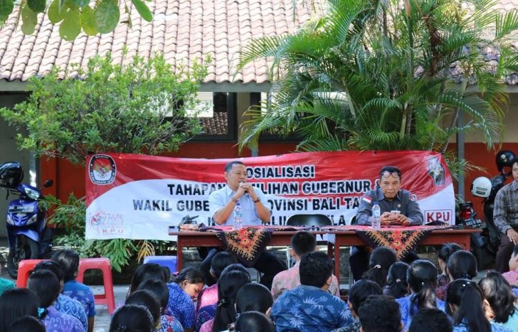 Denpasar, kpu-denpasarkota.go.id- KPU dan Panwaslu Denpasar Sosialisasikan Pilgub Bali 2018 kepada Siswa/Siswi SMA PGRI 2 Denpasar pada hari ini Kamis (03/05/18). Sosialisasi yang berlangsung pukul 09.00 wita di halaman SMA PGRI 2 Denpasar ini disampaikan oleh IGN Agung Darmayuda (Anggota KPU Kota Denpasar) dan I Wayan Sudarsana (Ketua Panwaslu Kota Denpasar). Agung Darmayuda menyampaikan beberapa hal terkait Pilgub 2018 seperti tahapan Pilgub, siapa saja yang dapat menggunakan hak pilih serta tata cara penggunaannya dan partisipasi pemilih. Sedangkan Sudarsana menjelaskan tentang larangan-larangan dalam pelaksanaan Pilgub dari awal sampai akhir tahapannya. Sudarsana pun mengajak siswa untuk ikut mengawasi pelaksanaan Pilgub Bali 2018 dan melaporkan kepada Panwaslu apabila menemukan terjadinya pelanggaran. Selanjutnya, KPU dan Panwaslu Kota Denpasar mengingatkan para siswa yang telah berusia 17 tahun untuk menggunakan hak pilihnya pada Pilgub Bali, 27 Juni 2018 mendatang.