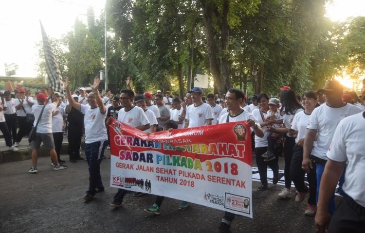 Denpasar, kpu-denpasarkota.go.id-Sabtu (14/04/18), KPU Denpasar mengajak masyarakat berkumpul untuk Gerak Jalan Sehat. Gerak Jalan Sehat yang diikuti 3.000 peserta tersebut dimulai pukul 06.35 wita dan dibuka oleh Plt. Walikota Denpasar, I Gusti Ngurah Jaya Negara. Forum Komunikasi Pimpinan Daerah (Forkompinda), Ketua KPU Propinsi Bali, Ketua Panwaslu Kota Denpasar, PPK dan PPS se-Kota Denpasar, Camat dan Kepala Desa/Lurah se-Kota Denpasar, Kepala lingkungan/dusu se-Kota Denpasar, Guru dan Siswa/Siswi SMA serta SMK se-Kota Denpasar mengambil bagian dalam Gerak Jalan Sehat ini. Rute yang dilewati peserta Gerak Jalan Sehat adalah Museum Bali-Jl. Belinton-Jl. Sumatra-Jl. Hasanudin-Jl. Thamrin-Jl. Gajah Mada-Patung Catur Muka-Jl. Surapati-Pura Jagat Natha-Depan Museum Bali. Di sepanjang rute yang dilewati, Plt Walikota Denpasar, Ketua KPU Propinsi Bali dan Kota Denpasar membagikan Baju Kaos bertuliskan “Ingat Pilgub Bali 27 Juni 2018” kepada pedagang, sopir angkutan umum, pejalan kaki serta petugas kebersihan sekaligus menhimbau mereka untuk menggunakan hak pilihnya. Pukul 07.30 wita, peserta Gerak Jalan Sehat kembali berkumpul di sekitar Panggung Lapangan Puputan mengikuti acara Gerakan Masyarakat Sadar Pilkada Serentak 2018. Ketua KPU Kota Denpasar, I Gede John Darmawan memberikan sambutan yang isinya mengingatkan masyarakat akan Pilgub Bali 2018 yang sudah di depan mata sehingga pengalaman Pilkada Tahun 2015 yaitu rendahnya partisipasi pemilih di Kota Denpasar tidak terulang. “Ayo datang ke TPS, pilih yang pemimpin yang tepat dan kawal proses penghitungannya sehingga proses demokrasi di Indonesia pada umumnya dan Bali khususnya berjalan maju bukan sebaliknya”seru John Darmawan. Sambutan senada juga disampaikan oleh Ketua KPU Propinsi Bali, I Dewa Kade Wiarsa Raka Sandi. Tak lupa Raka Sandi mengajak masyarakat menyaksikan Debat Pasangan Calon Pilgub Bali Tahun 2018 yang diadakan pada bulan April, Mei dan Juni secara live di TVOne, iNews, TVRI serta BaliTV. Sealnjutnya KPU Kota Denpasar mengajak beberapa perwakilan instansi yang menjadi peserta Gerak Jalan Sehat mendeklarasikan “Gerakan Sadar Pilkada Serentak 2018”. Usai deklasrasi “Gerakan sadar Pilkada Serentak 2018”, peserta Gerak Jalan Sehat menikmati hiburan yang disediakan KPU Kota Denpasar sambil mengikuti pembagian doorprice.