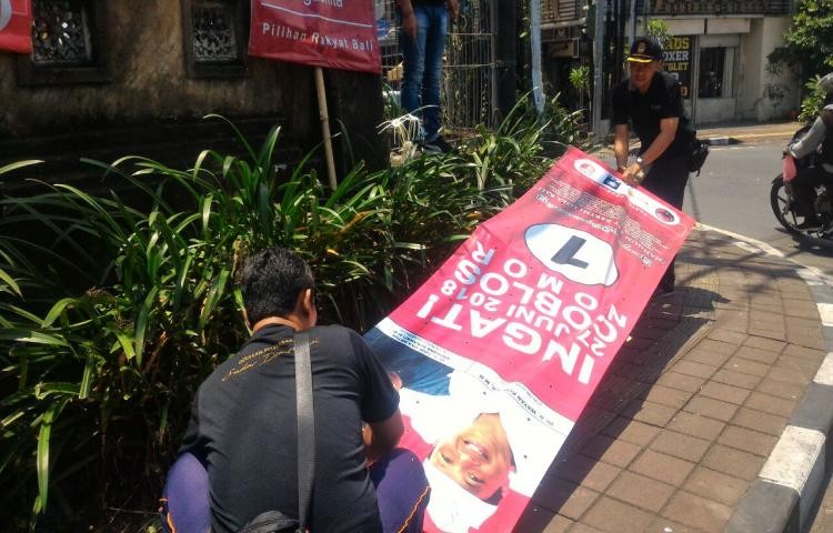 Denpasar, kpu-denpasarkota.go.id- Akhir Februari 2018, Alat Peraga Kampanye (APK) Pilgub Bali 2018 yang difasilitasi KPU telah selesai dipasang. Jumat (02/03/18) pukul 11.00 wita, KPU Kota Denpasar melakukan monitoring terhadap APK yang fasilitasi KPU dan pasangan calon pada titik-tik yang telah ditentukan. Monitoring dipimpin oleh Ketua KPU Kota Denpasar I Gede John Darmawan didampingi IGN. Agung Darmayuda (Anggota KPU Denpasar Divisi SDM dan Parmas) serta 4 orang Anggota Kelompok Kerja Kampanye. Berdasarkan hasil monitoring, APK jenis umbul-umbul fasilitasi KPU yang terpasang di Simpang Mahendradata-Jl. Gunung Agung tercabut 1 buah dan 1 buah lagi posisinya digeser dengan baliho ucapan “Selamat Hari Raya Nyepi” oleh Ketua DPC Demokrat, A.A Asmara putra (Gung Cilik). Namun umbul-umbul yang tercabut sudah dipasang kembali oleh KPU Kota Denpasar sedangkan baliho milik Partai Demokrat telah dipindah oleh yang bersangkutan ke sudut persimpangan depan Dealer Suzuki. Sampai dengan pelaksanaan monitoring, APK dari pasangan calon belum terpasang. Setelah dikonfirmasi kepada pasangan calon, mereka menyampaikan bahwa APK masih dalam proses pembuatan. Monitoring berlangsung dengan kondusif dan berakhir pukul 12.00 wita.