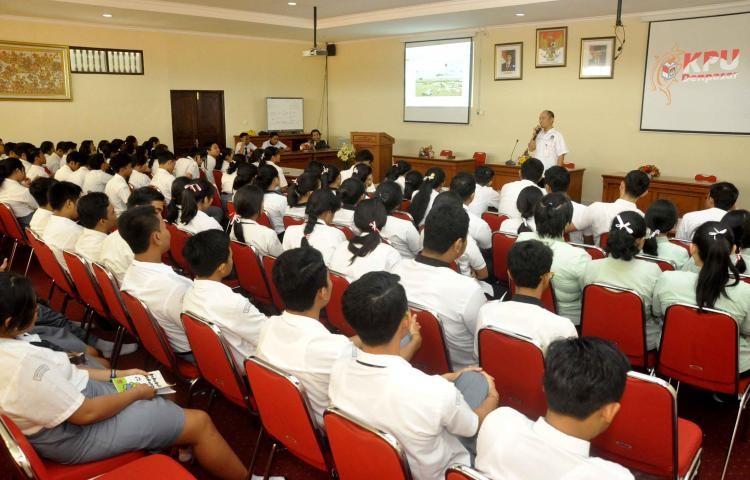 Denpasar,(kpu-denpasarkota.go.id)-Komisi Pemilihan Umum (KPU) Kota Denpasar menggelar sosialisasi kepada pemilih pemula di SMKN 4Denpasar, Jl. DrupadiDenpasar. Selasa,(8/8/2017). Sosialisasi berupa kelas pemilu dilaksanakan di Aula SMKN 4 Denpasar yang diikuti oleh 84siswaperwakilan dari seluruh kelas XII SMKN 4 Denpasar. Narasumber dalam kelas pemilu yang berlangsung selama satu (1) jam pelajaran adalah Komisioner KPU Kota Denpasar Divisi Teknis I Wayan Arsa Jaya. Arsa Jaya dalam materinya memaparkan tentang pemilih pemula, penggertian pemilu, sejarah pemilu, manfaat pemilu dan penyelenggara pemilu. Suasana kelas pemilu mulai panas ketika sesi tanya jawab berlangsung. Salah seorang siswa bernama Intan bertanya mengenai penyebab TNI/Polri yang tidak memiliki hak suara dalam pemilu, dan pertanyaan Intan ditanggapi oleh Anggota OSIS bernama Agung yang menyebutkan jika TNI/Polri memiliki hak suara maka akan terjadi intimidasi dari pihak yang berhubungan dengan TNI/Polri. Pernyataan Agung dibantah kembali oleh Intan yang mengatakan jika terjadi intimidasi itu merupakan pelanggaran HAM. Arsa Jaya sangat mengapresiasi adu argumen antara siswa tersebut, dan Arsa Jaya juga berharap pemaparannya dalam kelas pemilu sampai ketelinga para siswa yang tidak mengikuti kelas pemilu. Dan diakhir sesi kelas pemilu Arsa Jaya berpesan agar para pemilih pemula benar-benar munggunakan hak pilihnya dalam setiap pemilu, baik itu Pileg, Pilpres dan Pilkada. (sm/ppidkpudps)
