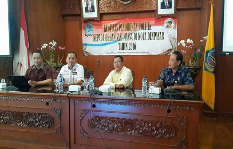 Ratusan anggota organisasi massa (Ormas) memdati Aula Praja Utama Kantor Walikota Denpasar, Rabu (24/8). Hal tersebut berkaitan dengan Pendidikan Politik yang diselenggarakan oleh Badan Kesatuan Bangsa dan Politik (Kesbangpol) Kota Denpasar. Sebagai narasumber dalam pendidikan politik ormas tersebut adalah dari Komisi Pemilihan Umum (KPU) Kota Denpasar, Polresta Denpasar, dan Fakultas Ilmu Sosial dan Ilmu Politik Universitas Udayana (Fisip Unud). KPU Kota Denpasar yang diwakili oleh Divisi Sosialisasi IGST Ngurah Agung Darmayuda memberikan materi Kesiapan KPU Dalam Rangka Menghadapi Pemilukada/Pilgub/Pilpres. Dalam materinya, Agung Darmayuda juga menambahkan tentang perbanyak politikus baik dengan menjadi pemilih cerdas. Dalam pendidikan politik ormas tersebut materi dari Polresta Denpasar adalah koordinasi aparat keamanan dan ormas guna menciptakan suasana aman dalam rangka menghadapi Pemilukada/Pilgub/Pilpres. Dan hubungan kelembagaan ormas dan pemerintah dalam rangka menghadapi Pemilukada/Pilgub/Pilpres dari Fisip Unud.