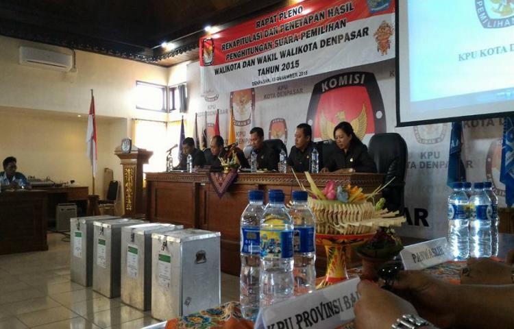 Komisi Pemilihan Umum (KPU) Kota Denpasar melaksanakan Rapat Pleno Rekapitulasi & Penetapan Hasil Penghitungan Suara Pemilihan Walikota dan Wakil Walikota Denpasar Tahun 2015 tingkat KPU Kota Denpasar pada hari Kamis, 17 Desember 2015. Rapat pleno yang berlangsung dari pukul 10.00-12.30 Wita ini dihadiri oleh PPK se-Kota Denpasar, Saksi dari masing-masing pasangan calon dan Panwaslih Kota Denpasar beserta jajarannya. Mekanisme rekapitulasi hasil penghitungan suara tingkat Kota Denpasar dilaksanakan dengan membacakan sertifikat dan hasil perolehan suara tiap-tiap kecamatan. Diawali oleh Ketua PPK Denpasar Barat, I Wayan Manuyasa. Selanjutnya Denpasar Selatan diwakili oleh anggota, I Wayan Yusmika, Kecamatan Denpasar Timur I Ketut Suana dan terakhir Ibu Sekar Anggreni dari PPK Denpasar Utara. Dalam rekap ini ditetapkan hasil penghitungan suara masing-masing pasangan calon, yakni sebagai berikut. Pasangan Calon Nomor Urut 1 (Ida Bagus Rai Dharmawijaya Mantra, S.E., M.Si. dan I Gst Ngr Jaya Negara) memperoleh suara sebanyak 191.347. Pasangan Calon Nomor Urut 2 (I Ketut Resmiyasa, S.T. dan Ida Bagus Batuagung Antara) memperoleh suara sebanyak 12.739. Pasangan Calon Nomor Urut 3 (I Made Arjaya, S.E., M.Si. dan A.A. Ayu Rai Sunasri, S.Sos., M.Si.) memperoleh suara sebanyak 28.871. Penetapan rekapitulasi hasil penghitungan perolehan suara tersebut tertuang dalam surat keputusan nomor 119/Kpts/KPU-Kota-016.433809/2015. Sedangkan rincian dimasing-masing kecamatan tertuang dalam Model DB1-KWK. Model DB1-KWK tersebut telah ditandatangani oleh semua komisioner KPU Kota Denpasar dan saksi dari masing-masing pasangan calon, kecuali saksi dari pasangan calon nomor urut 3. Lebih lengkap tentang SK nomor 119/Kpts/KPU-Kota-016.433809/2015 dan Model DB1-KWK, dapat di klik disini.