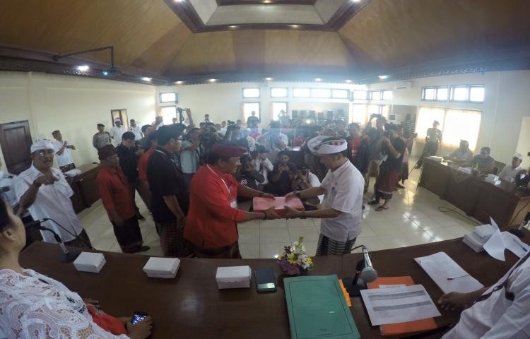 Hari ini Selasa, 28 Juni 2015 tepat di hari terakhir pendaftaran bakal pasangan calon Walikota dan Wakil Walikota Denpasar Tahun 2015, Komisi Pemilihan Umum (KPU) Kota Denpasar menyambut kedatangan I Ketut Suwandi, S.Sos. dan I Made Arjaya, S.E., M.Si. di Kantor KPU Kota Denpasar Jalan Raya Puputan Renon Denpasar. I Ketut Suwandi, S.Sos. dan I Made Arjaya, S.E., M.Si adalah bakal pasangan calon Walikota dan Wakil Walikota yang di usung oleh gabungan partai dari partai Golkar, Partai Gerindra dan Partai Demokrat. I Ketut Suwandi, S.Sos. dan I Made Arjaya, S.E., M.Si beserta rombongan tim pemenangannya tiba di Kantor KPU Kota Denpasar Pukul 14.30 Wita. Bertempat di Ruang Rapat Lantai III Kantor KPU Kota Denpasar, bakal pasangan calon beserta tim pemenangannya menyerahkan berkas syarat pendaftaran untuk kemudian diperiksa oleh Tim Pemeriksa Berkas. “Setelah diperiksa, berkas sudah lengkap meski ada beberapa yang masih belum memenuhi syarat” ujar I Made Raka Suwarna, S.H., M.H., Ketua Pokja Pencalonan KPU Kota Denpasar usai penerimaan berkas. Kelengkapan berkas dimaksud, bisa dilengkapi sampai tanggal 7 Agustus mendatang. Dengan berakhirnya masa pendaftaran bakal pasangan calon walikota dan Wakil Walikota Denpasar Tahun 2015 hari ini, dipastikan di Kota Denpasar terdapat 2 Pasangan Calon dalam Pilkada serentak 9 Desember 2015 mendatang, pungkas Raka.