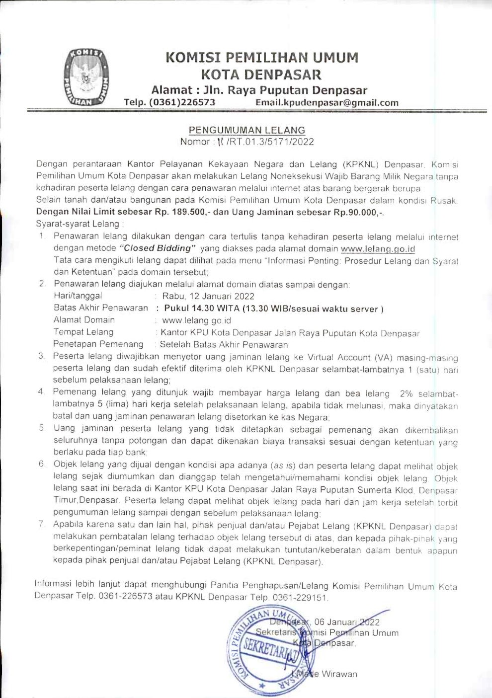 KPU Kota Denpasar mengumumkan hasil pemutakhiran data pemilih berkelanjutan bulan Januari. Sesuai dengan Berita Acara nomor 28/PP.07/5171/2022 ditetapkan jumlah pemilih bulan Desember sebanyak 441.044 pemilih dengan rincian pemilih laki-laki berjumlah 217.327 pemilih dan pemilih perempuan berjumlah 223.717 pemilih, tersebar di 4 kecamatan dan 43 desa/ kelurahan, klik di link berikut.https://drive.google.com/drive/folders/1kBpM1MqlXhQ9mSW23Bk-j-BpY8ZBOLB_?usp=sharing