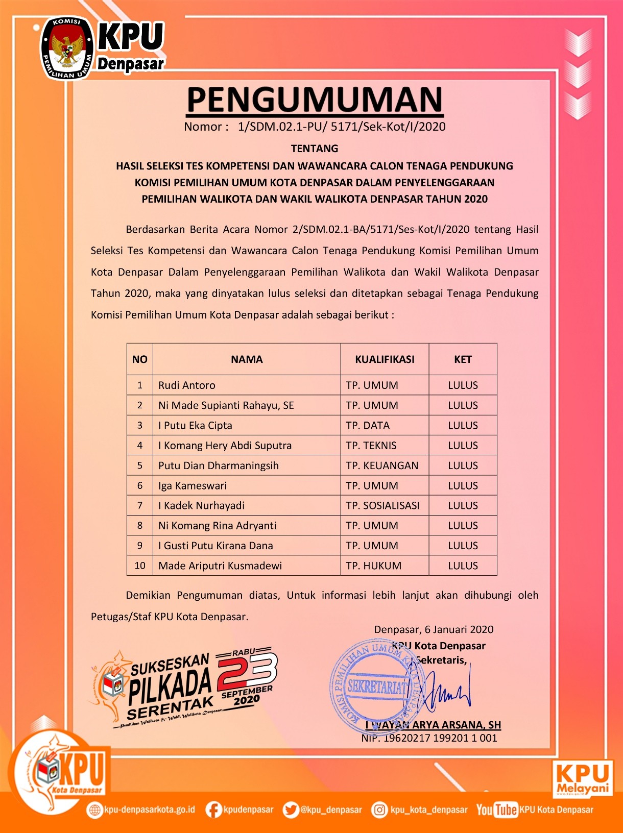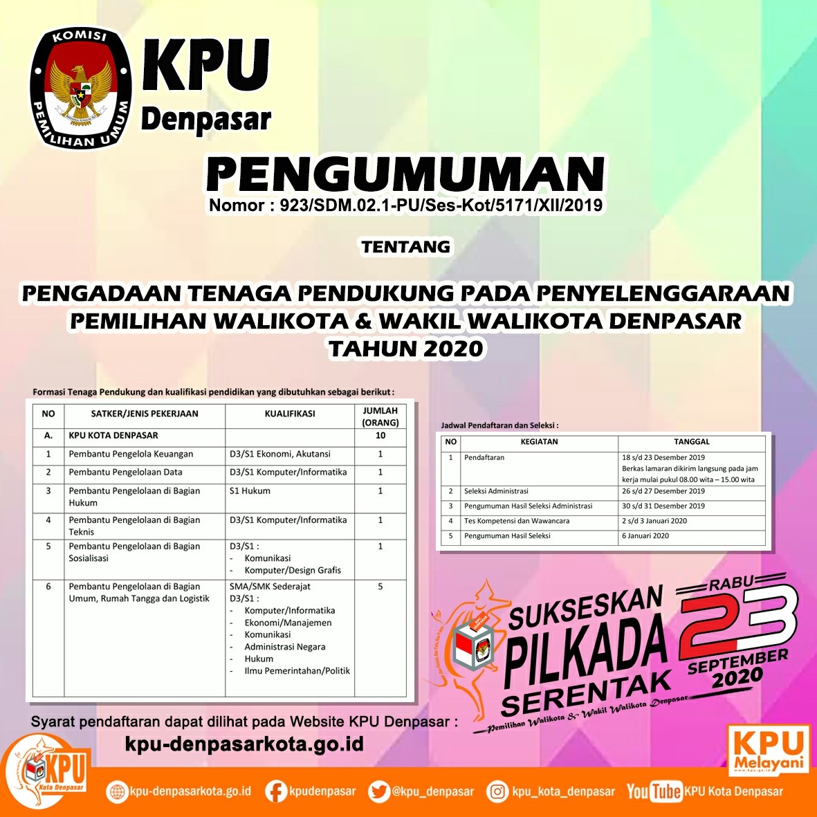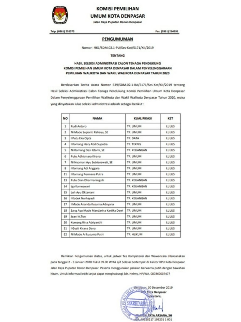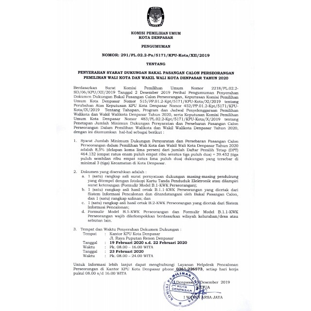 Denpasar, kpu-denpasarkota.go.id- Dalam rangka seleksi Calon Anggota Panitia Pemilihan Kecamatan, untuk Pemilihan Gubernur dan Wakil Gubernur, Bupati dan Wakil Bupati dan/atau Wali Kota dan Wakil Wali Kota Tahun 2020, Komisi Pemilihan Umum Kota Denpasar mengundang Warga Negara Indonesia yang memenuhi kualifikasi untuk mendaftarkan diri menjadi anggota Panitia Pemilihan Kecamatan untuk Pemilihan Tahun 2020. Untuk informasi lebih lanjut dapat datang langsung ke KPU Kota Denpasar, Jalan Raya Puputan Renon, Denpasar. Atau klik link berikut: https://bankdata.kpu-denpasarkota.go.id/bankdata/subkategori/119