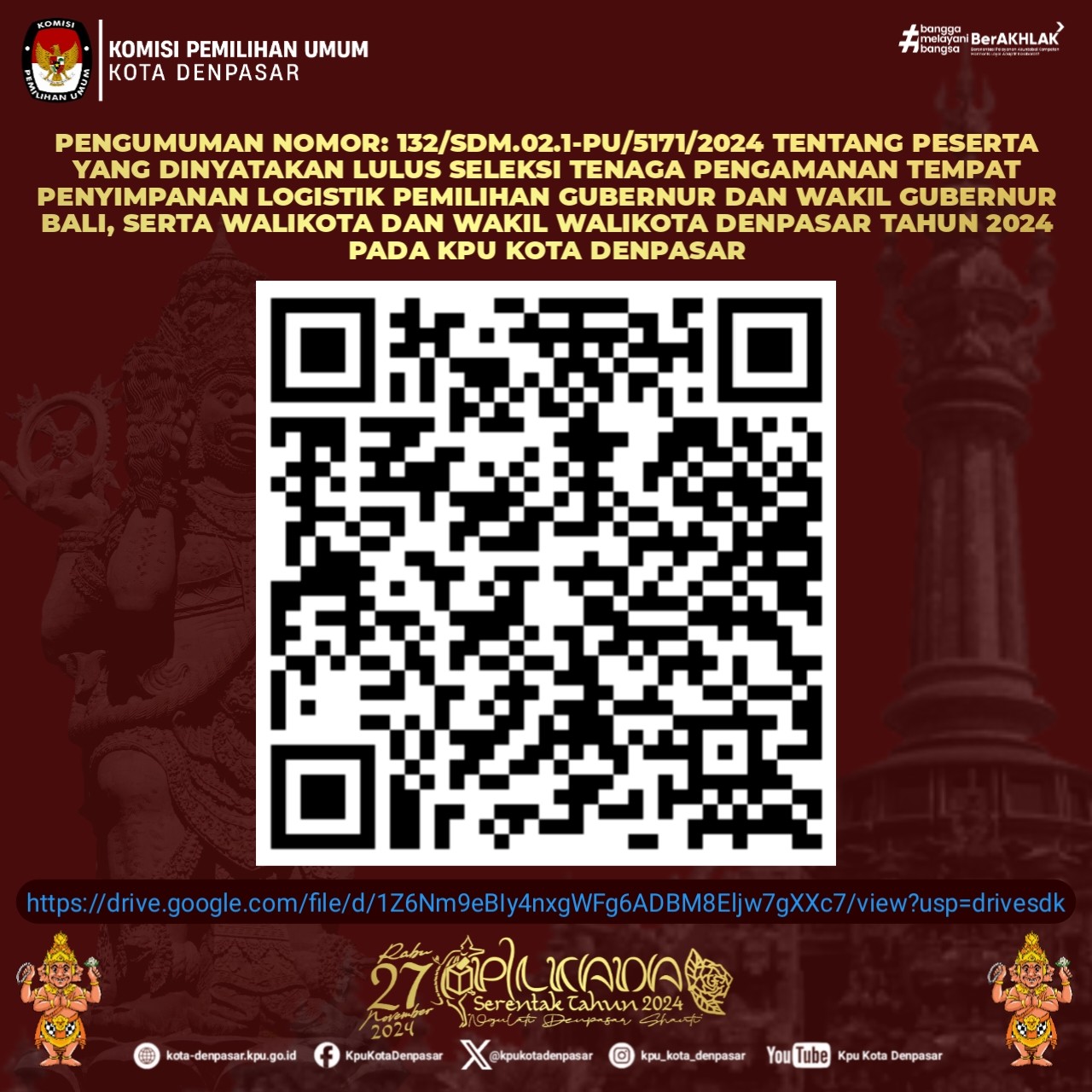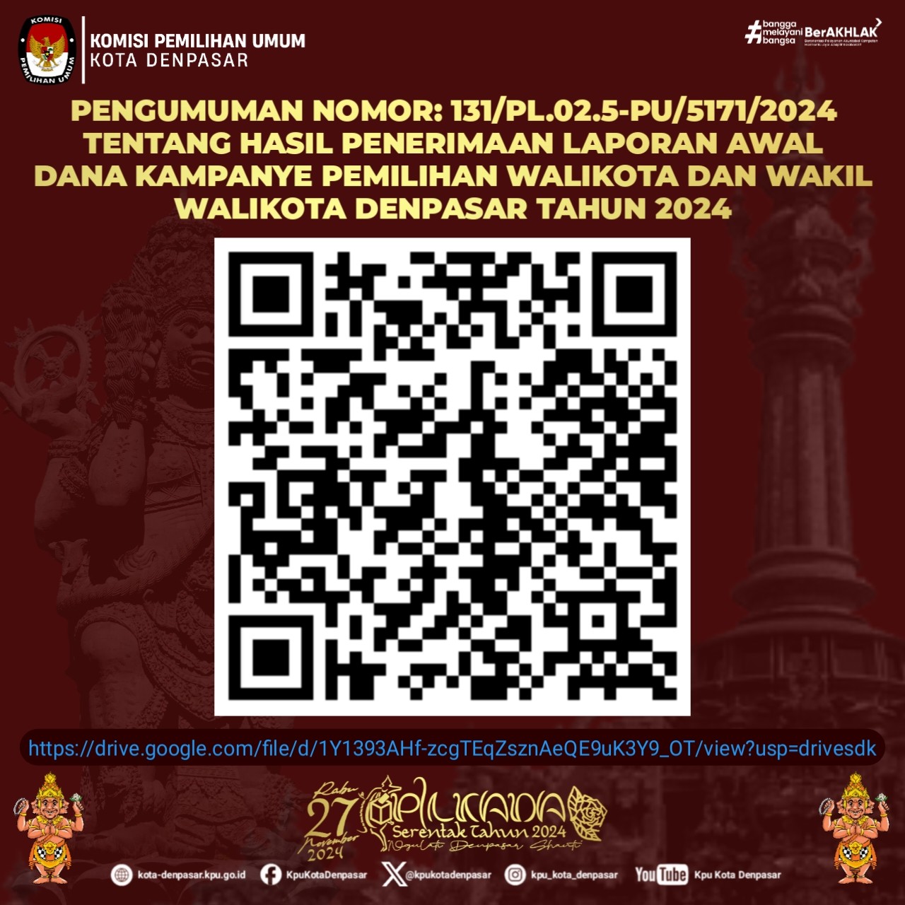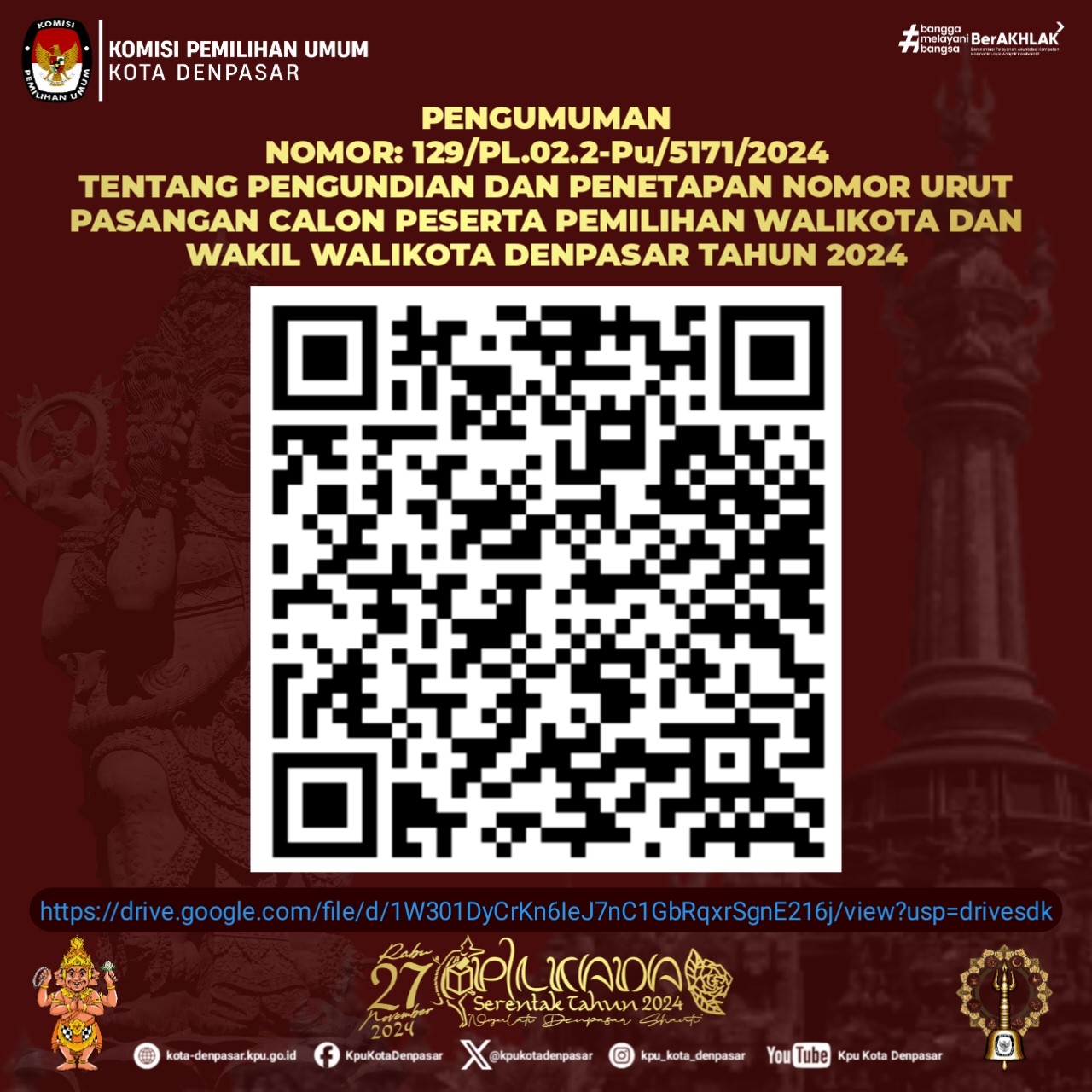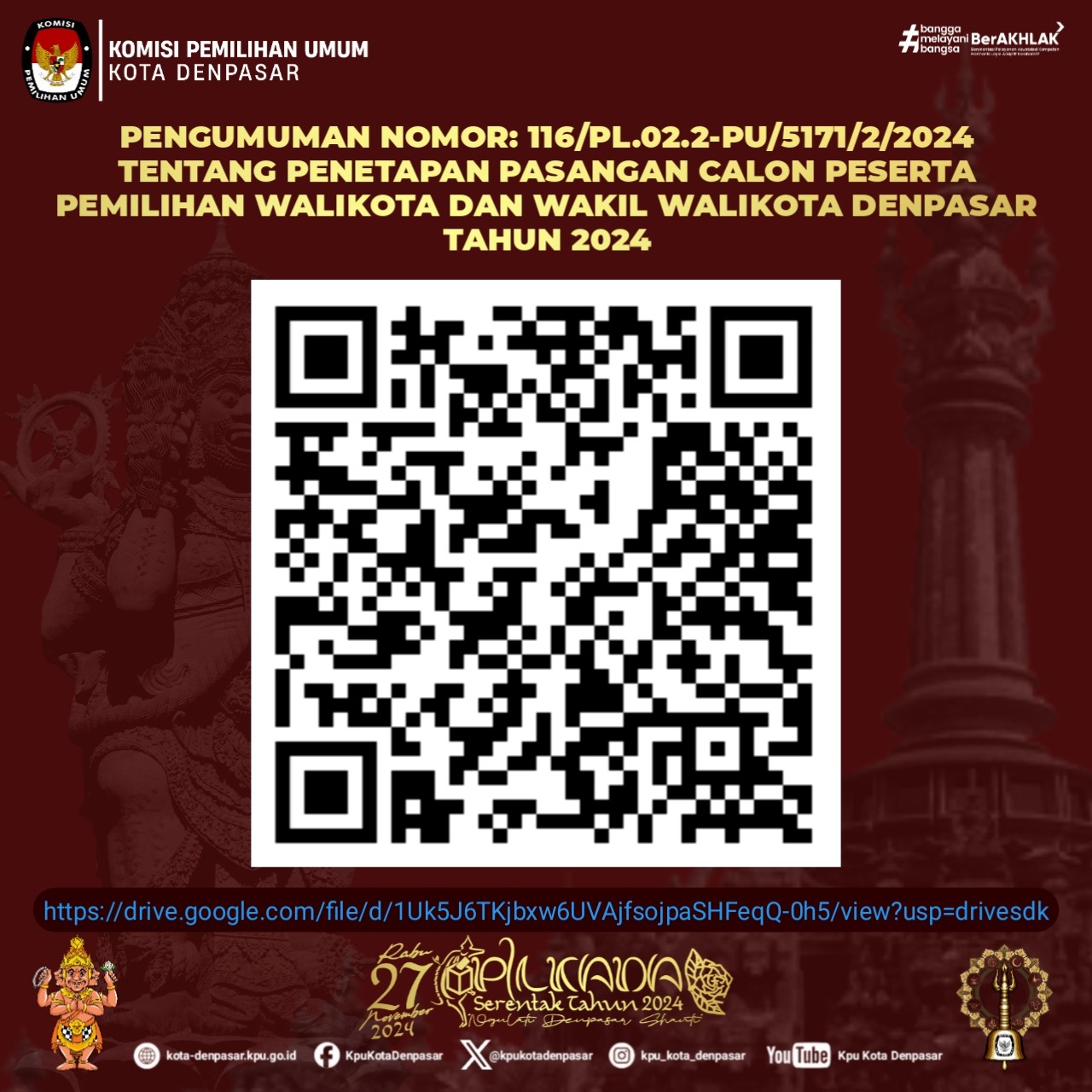 Bahwa untuk melaksanakan Pasal 120 ayat (4) Peraturan Komisi Pemilihan Umum Nomor 8 Tahun 2024 tentang Pencalonan Gubernur dan Wakil Gubernur, Bupati dan Wakil Bupati, serta Walikota dan Wakil Walikota, sebagaimana telah diubah dengan Peraturan Komisi Pemilihan Umum Nomor 10 Tahun 2024 tentang Perubahan atas Peraturan Komisi Pemilihan Umum Nomor 8 Tahun 2024 tentang Pencalonan Gubernur dan Wakil Gubernur, Bupati dan Wakil Bupati, serta Walikota dan Wakil Walikota, dan berdasarkan Keputusan Komisi Pemilihan Umum Kota Denpasar Nomor 376 Tahun 2024 tentang Penetapan Pasangan Calon Peserta Pemilihan Walikota dan Wakil Walikota Denpasar Tahun 2024, Komisi Pemilihan Umum Kota Denpasar mengumumkan hasil Penetapan Pasangan Calon Peserta Pemilihan Walikota dan Wakil Walikota Denpasar Tahun 2024 sebagai berikut :