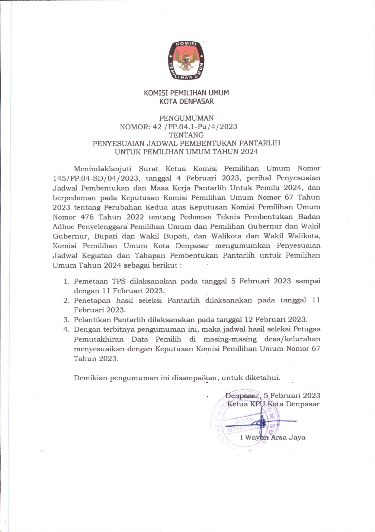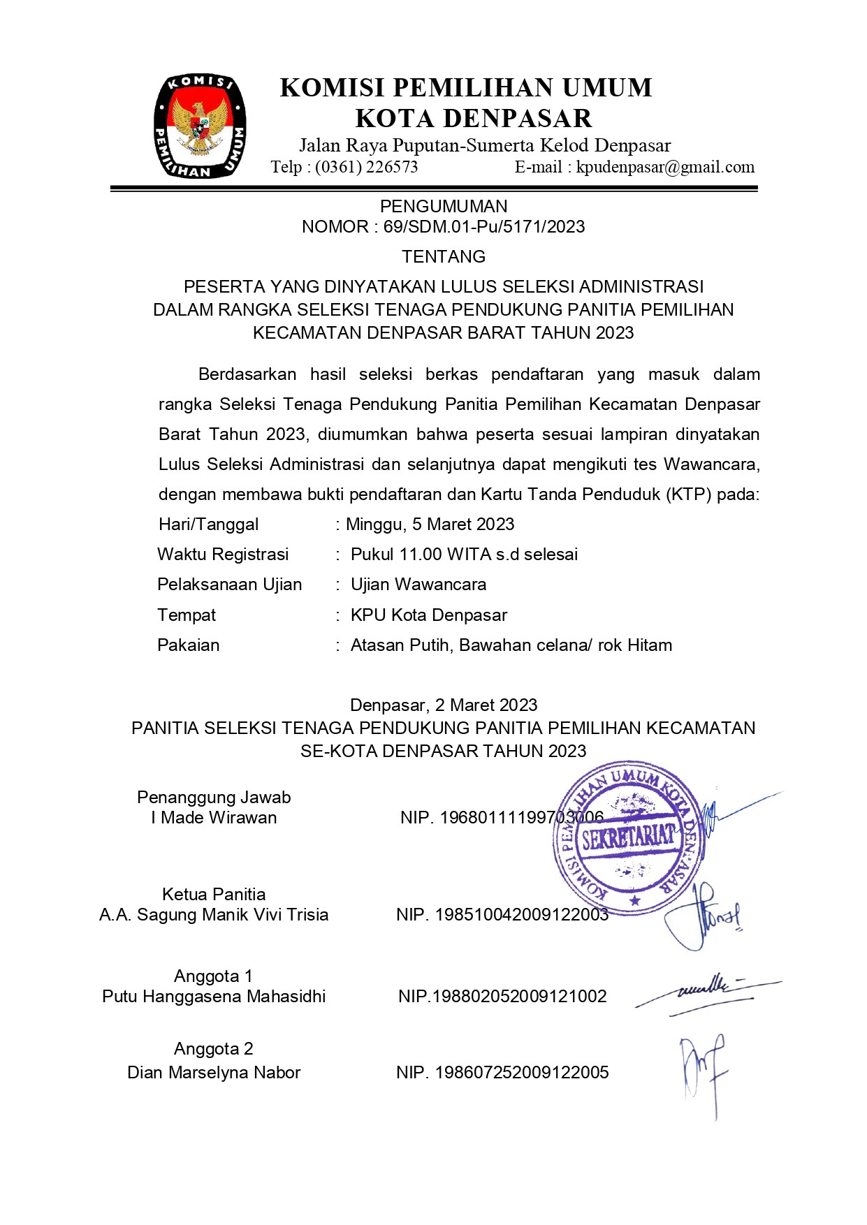 R : 69/SDM.01-Pu/5171/2023 TENTANG PESERTA YANG DINYATAKAN LULUS SELEKSI ADMINISTRASI DALAM RANGKA SELEKSI TENAGA PENDUKUNG PANITIA PEMILIHAN KECAMATAN DENPASAR BARAT TAHUN 2023 DAPAT DILIHAT PADA LINK BERIKUT