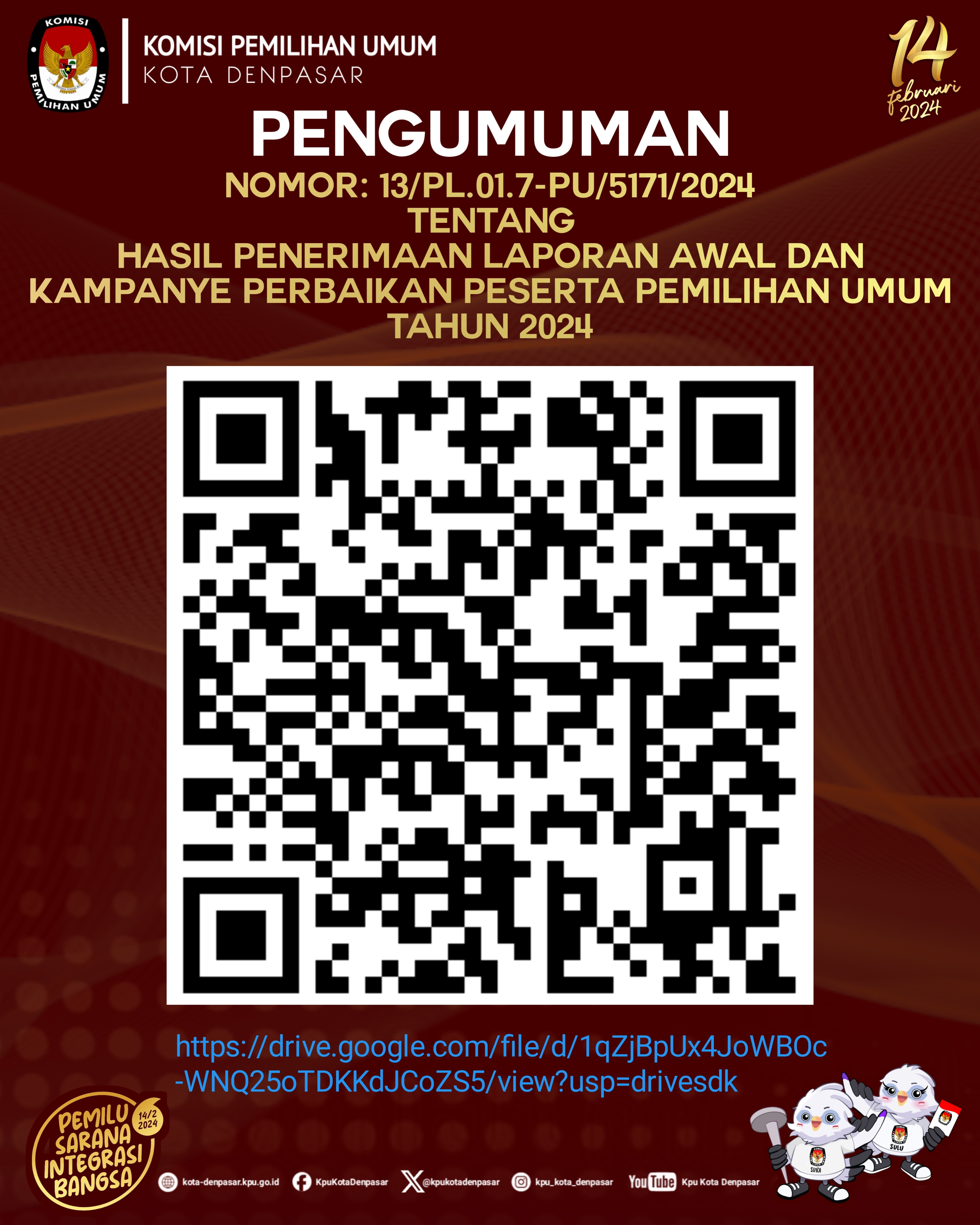 Berdasarkan Tanda Terima dan Berita Acara Penerimaan Perbaikan LADK Tahun 2024 di KPU Kota Denpasar, disampaikan hasil penerimaan LADK sebagai berikut: https://drive.google.com/file/d/1qZjBpUx4JoWBOc-WNQ25oTDKKdJCoZS5/view?usp=drivesdk