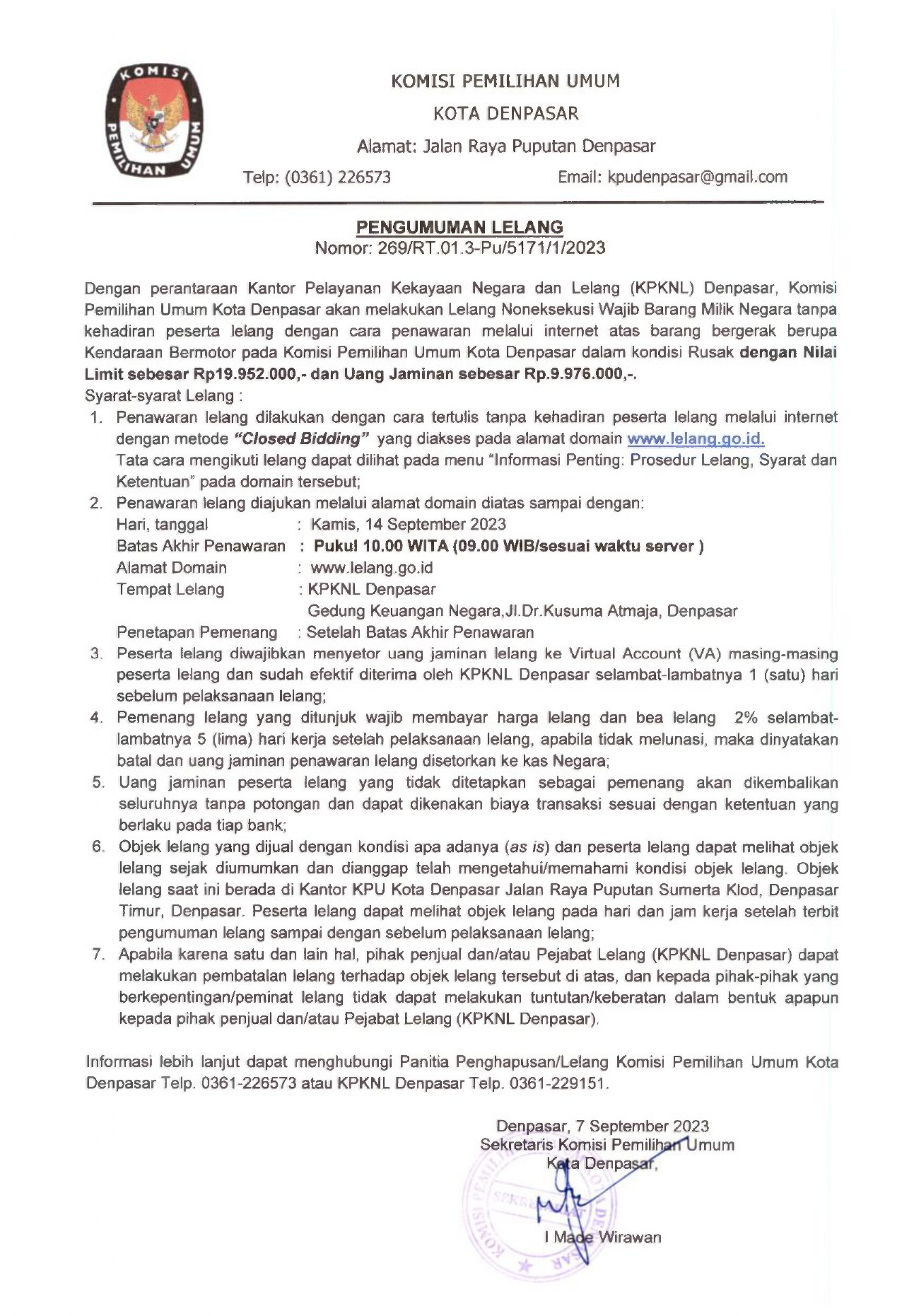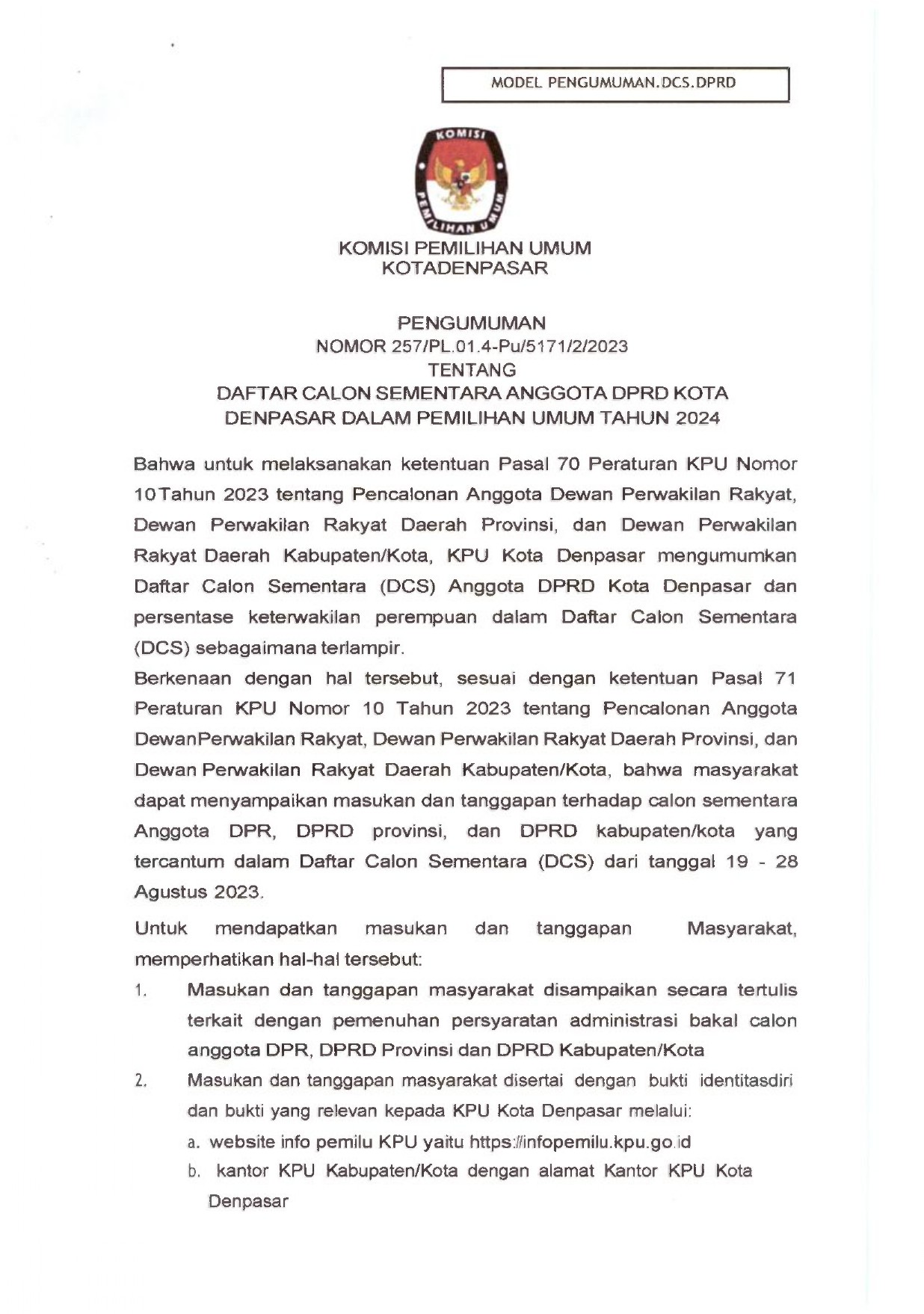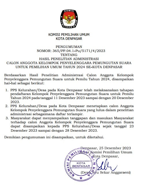 Berdasarkan Hasil Seleksi Calon Anggota Kelompok Penyelenggara Pemungutan Suara untuk Pemilu Tahun 2024, disampaikan hal-hal sebagai berikut: 1. PPS Kelurahan/Desa pada Kota Denpasar. telah melaksanakan tahapan pembentukan Kelompok Penyelenggara Pemungutan Suara untuk Pemilu Tahun 2024 pada tanggal 11 Desember 2023 sampai dengan 28 Desember 2023. 2. PPS Kelurahan/Desa pada Kota Denpasar. telah menetapkan calon Anggota Kelompok Penyelenggara Pemungutan Suara terpilih dari Hasil Seleksi sebagaimana dalam link berikut : https://drive.google.com/file/d/1hhQ2vIQbR652tMZC-uLql2KleuqF2uZc/view?usp=drivesdk 3. Sehubungan dengan hal tersebut di atas, calon Anggota Kelompok Penyelenggara Pemungutan Suara untuk segera melakukan pengunggahan mandiri dokumen administrasi ke siakba.kpu.go.id dan melakukan skrining riwayat kesehatan. 4. Calon Anggota Kelompok Penyelenggara Pemungutan Suara terpilih dapat melakukan konfirmasi kepada PPS Kelurahan/Desa masing- masing. Helpdesk Pembentukan KPPS KPU Kota Denpasar Alamat : Jl. Raya Puputan, Denpasar Kontak : (0361) 226573/081239651008/08155804846 Demikian pengumuman ini disampaikan, untuk diketahui.