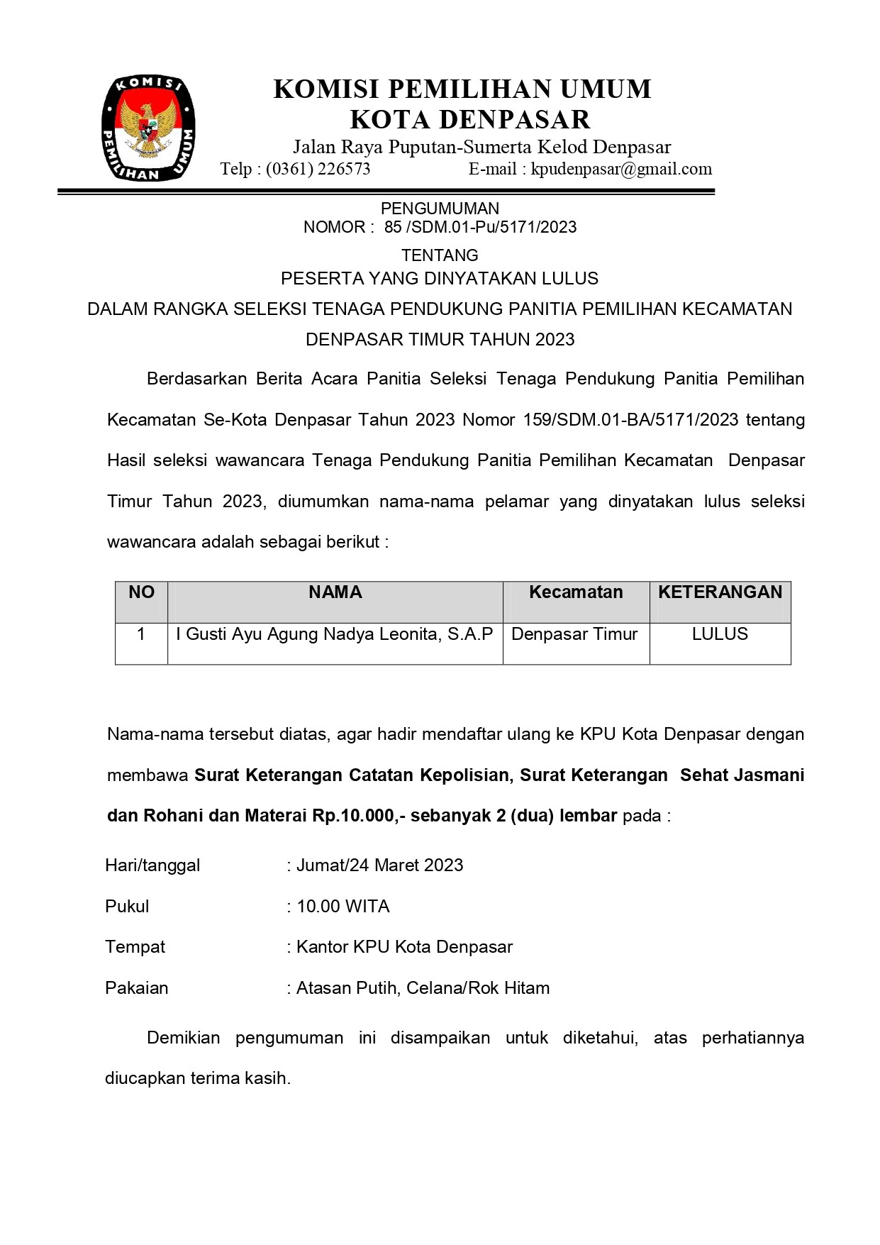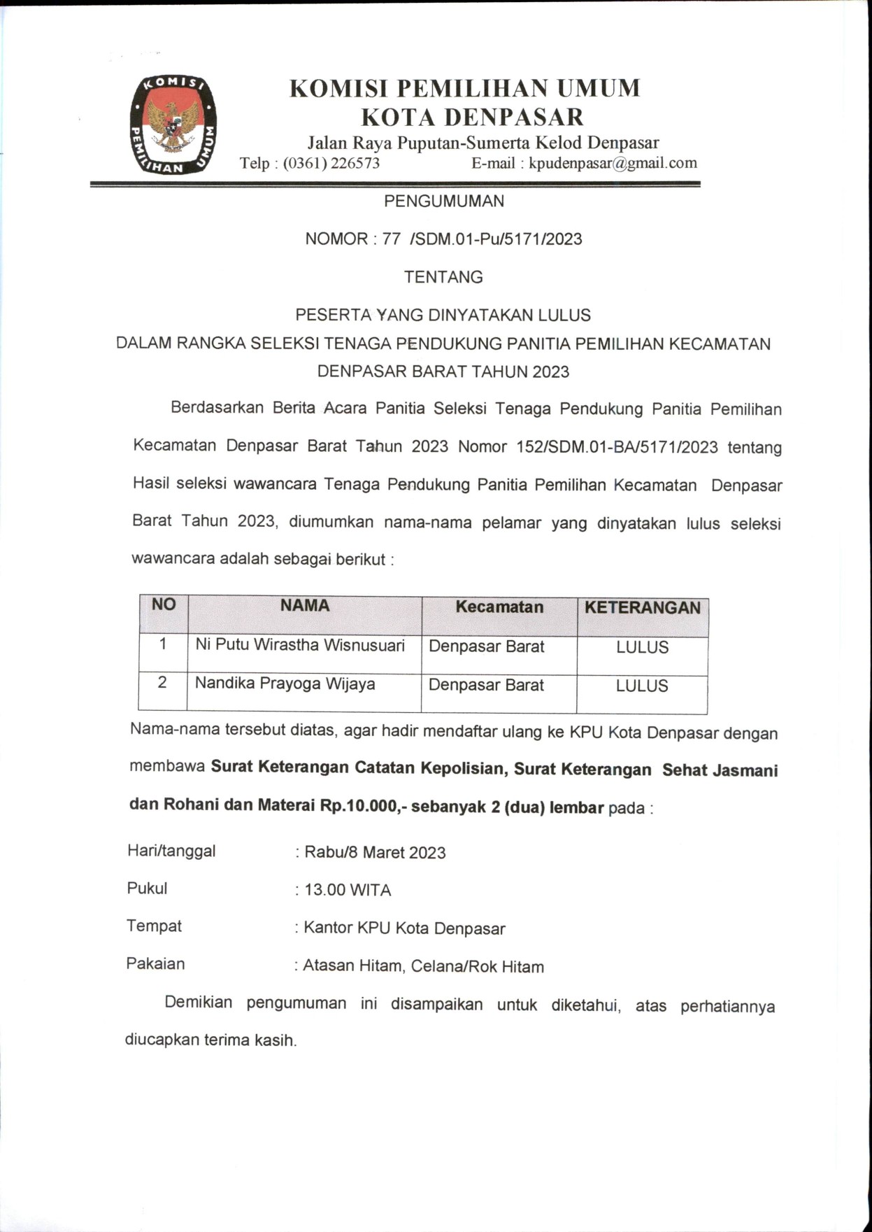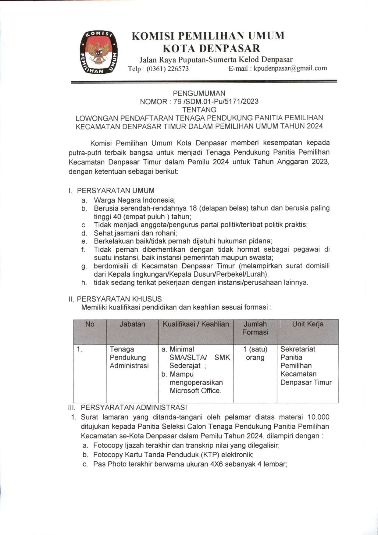 PENGUMUMAN NOMOR: 79/SDM.01-Pu/5171/2023 TENTANG LOWONGAN TENAGA PENDUKUNG PANITIA PEMILIHAN KECAMATAN DENPASAR TIMUR DALAM PEMILIHAN UMUM TAHUN 2024 DAPAT DI LIHAT PADA LINK BERIKUT