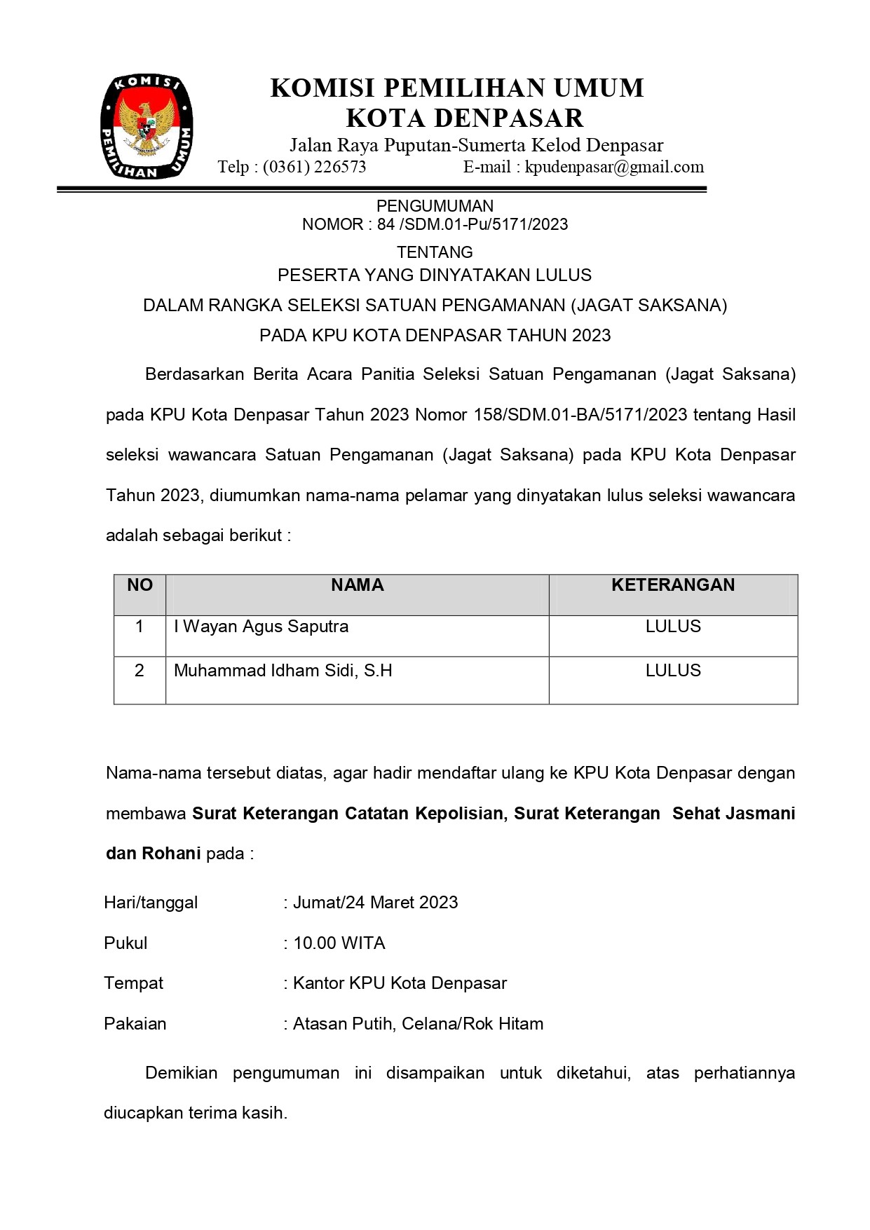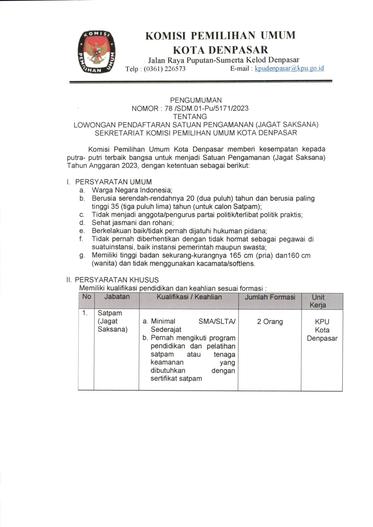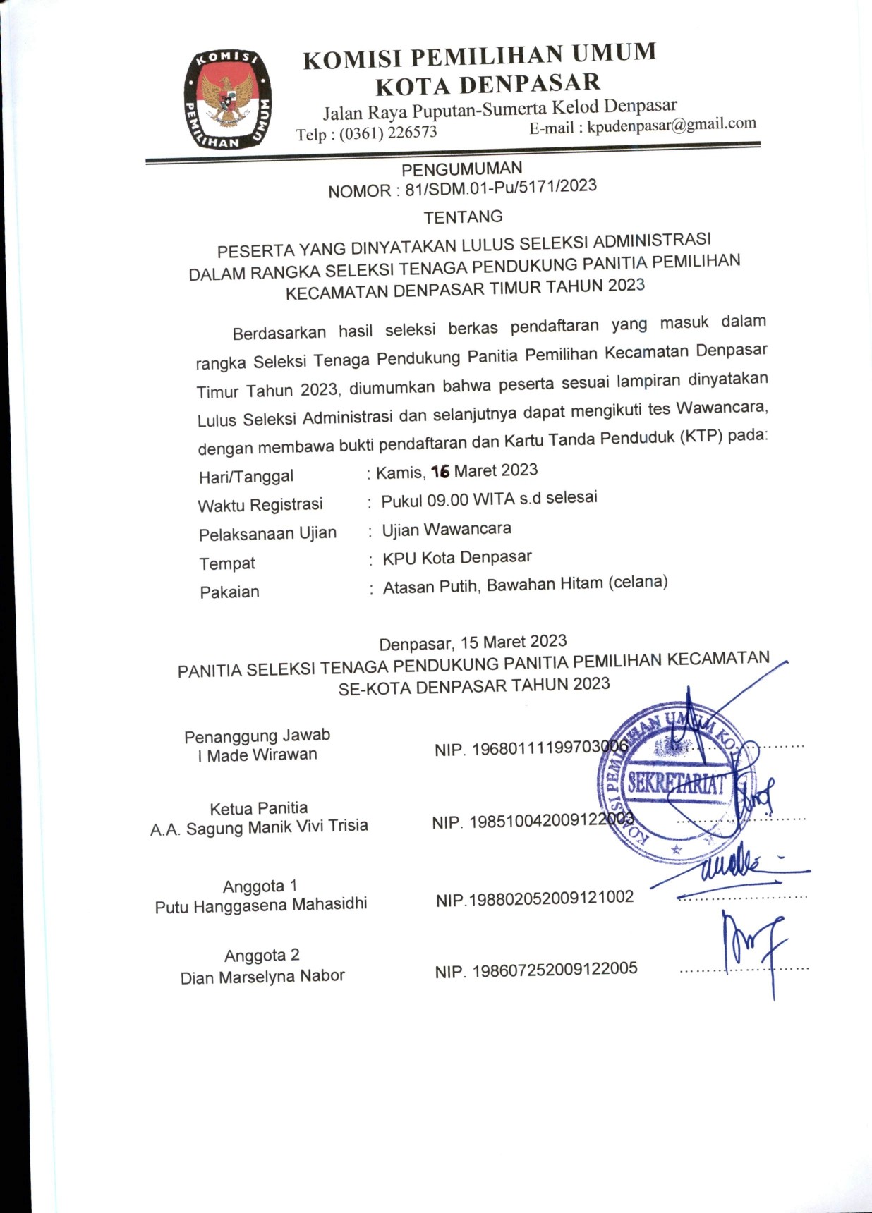 PENGUMUMAN NOMOR: 79/SDM.01-Pu/5171/2023 TENTANG LOWONGAN TENAGA PENDUKUNG PANITIA PEMILIHAN KECAMATAN DENPASAR TIMUR DALAM PEMILIHAN UMUM TAHUN 2024 DAPAT DI LIHAT PADA LINK BERIKUT