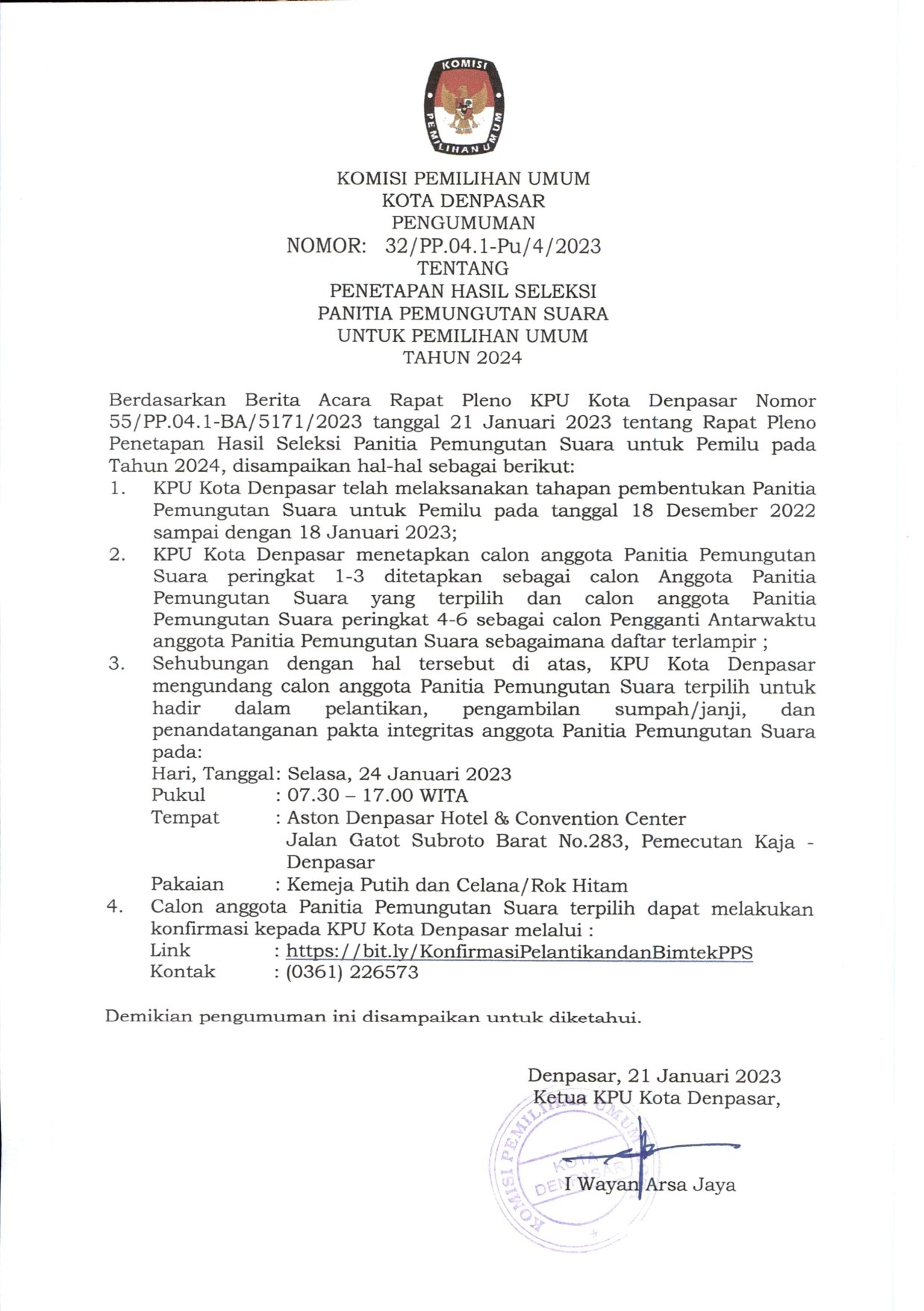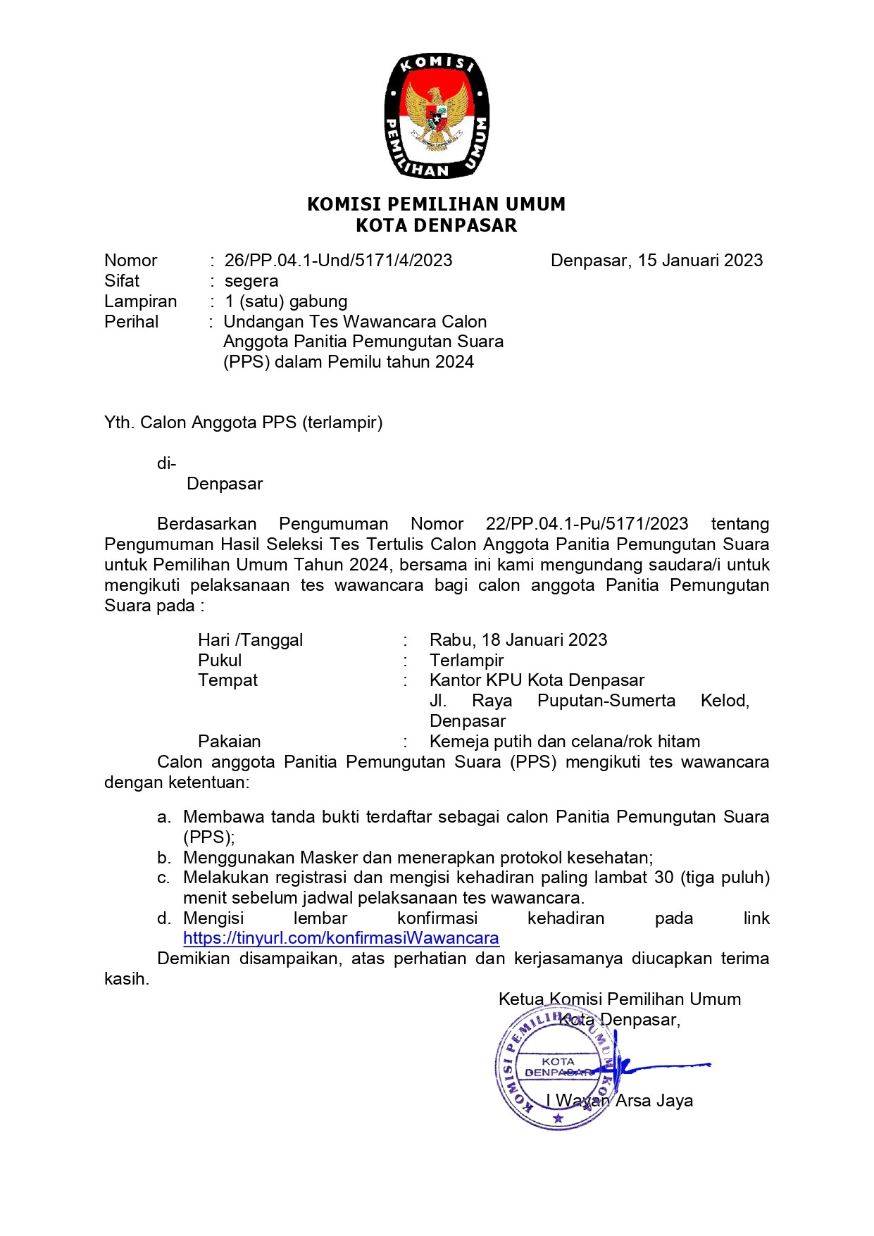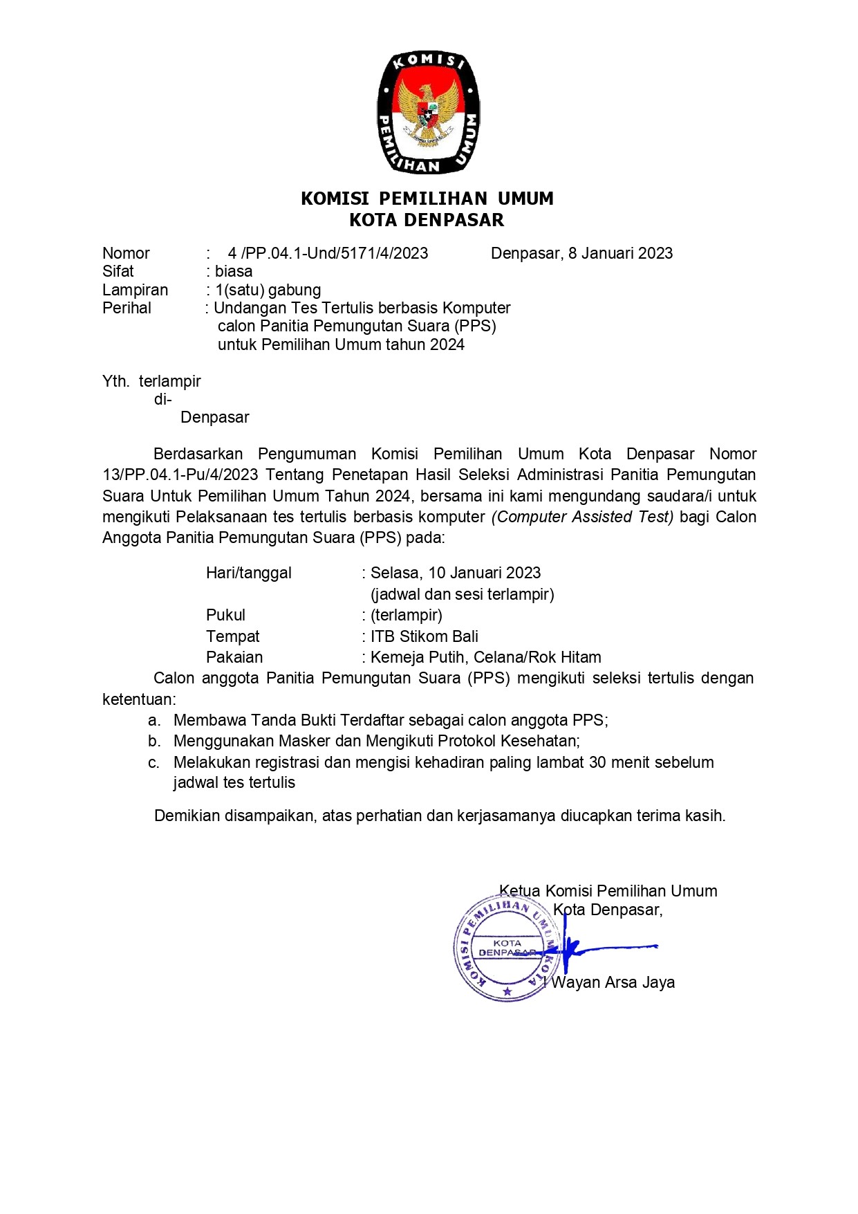 Undangan Tes Tertulis Berbasis Computer Calon Penitia Pemungutan Suara (PPS) untuk Pemilihan Umum Tahun 2024 Senin, 09 Januari 2023 07:00 869 Undangan Tes Tertulis Berbasis Computer Calon Penitia Pemungutan Suara (PPS) untuk Pemilihan Umum Tahun 2024 bisa dilihat pada link berikut ini Baca Selengkapnya