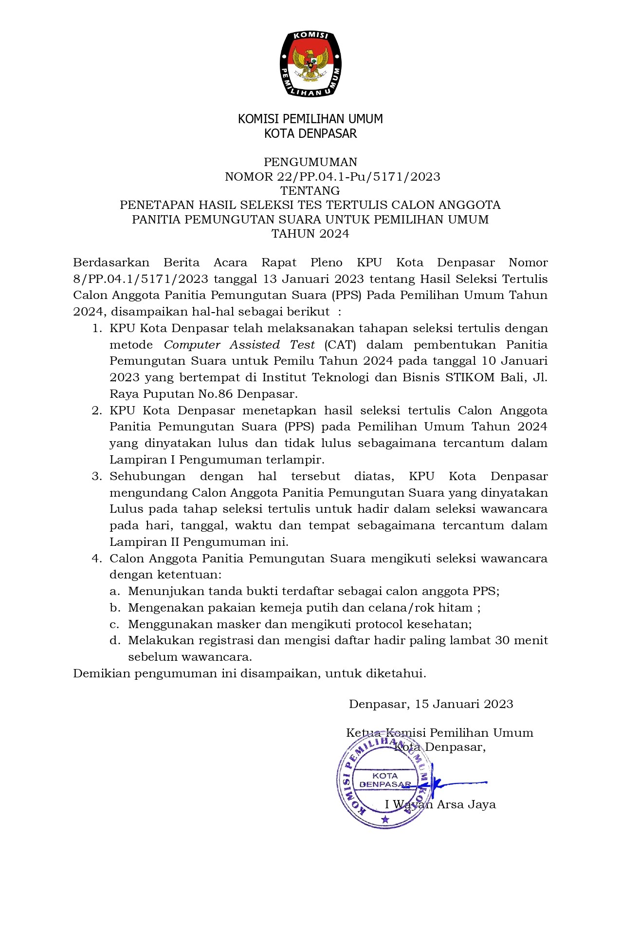 Pengumuman Hasil Seleksi Tes Tertulis Calon Anggota PPS (Panitia Pemungutan Suara) Pemilu Tahun 2024 Minggu, 15 Januari 2023 07:00 304 Pengumuman Penetapan Seleksi Tes Tertulis Calon Anggota PPS (Panitia Pemungutan Suara) Pemilu Tahun 2024 dapat dilihat pada link berikut ini Baca Selengkapnya
