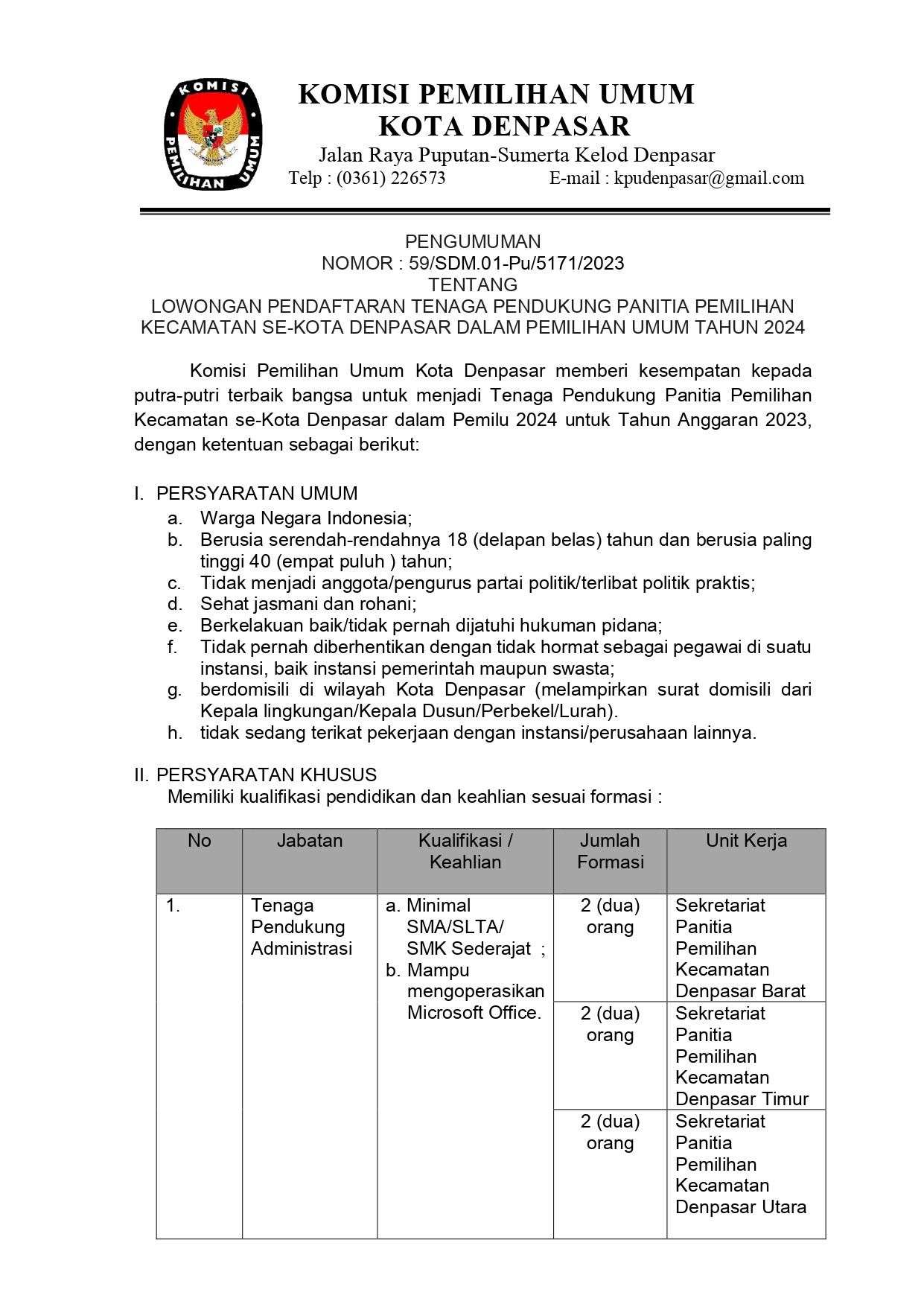 LOWONGAN PENDAFTARAN TENAGA PENDUKUNG PANITIA PEMILIHAN KECAMATAN SE-KOTA DENPASAR DALAM PEMILIHAN UMUM TAHUN 2024 Senin, 20 Februari 2023 07:00 459 LOWONGAN PENDAFTARAN TENAGA PENDUKUNG PANITIA PEMILIHAN KECAMATAN SE-KOTA DENPASAR DALAM PEMILIHAN UMUM TAHUN 2024 dapat dilihat pada link berikut Baca Selengkapnya